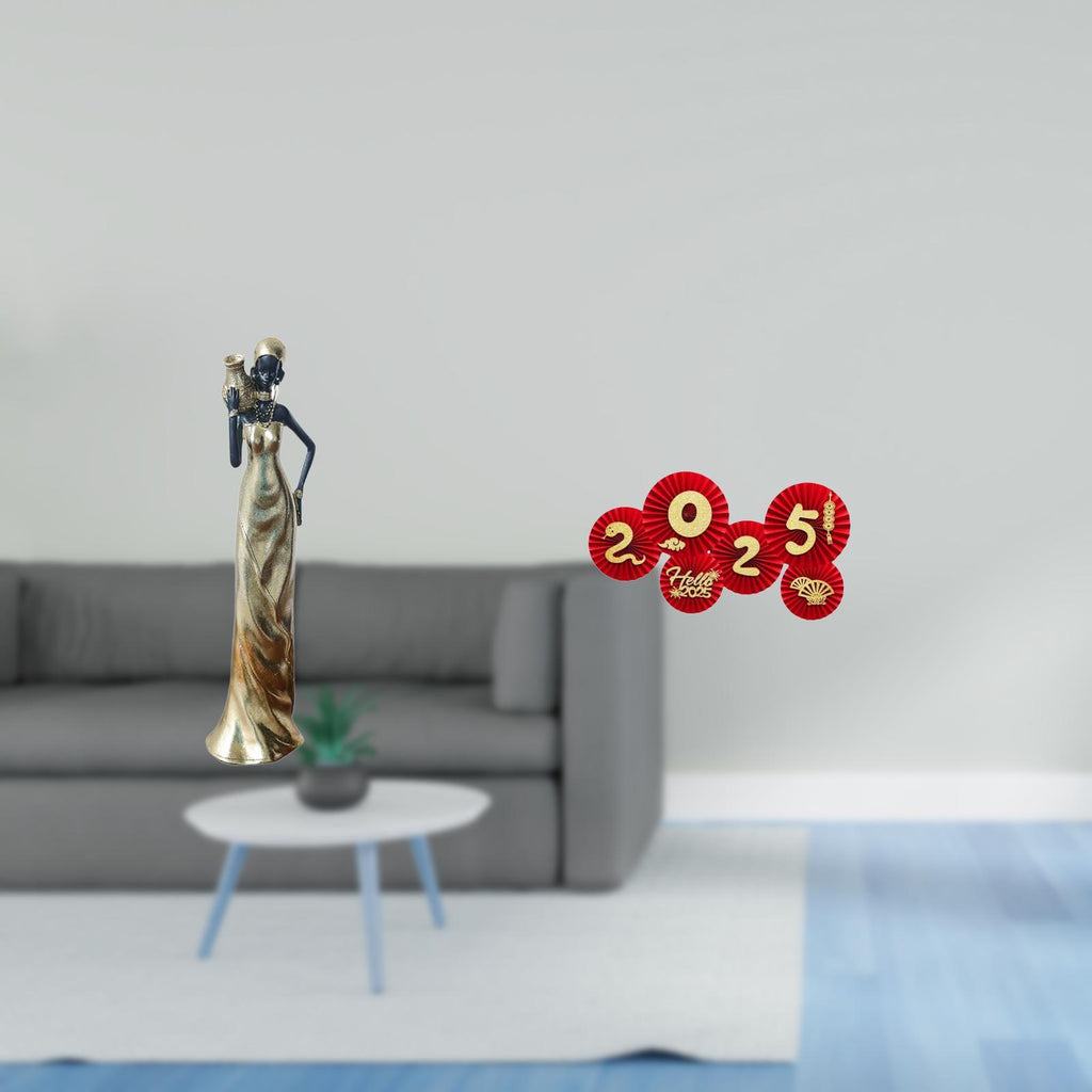 African Tribal Lady Figurine Sculpture Home Decor with Chinese New Year Paper Fan Blessing Ornament for Spring Festival Celebration