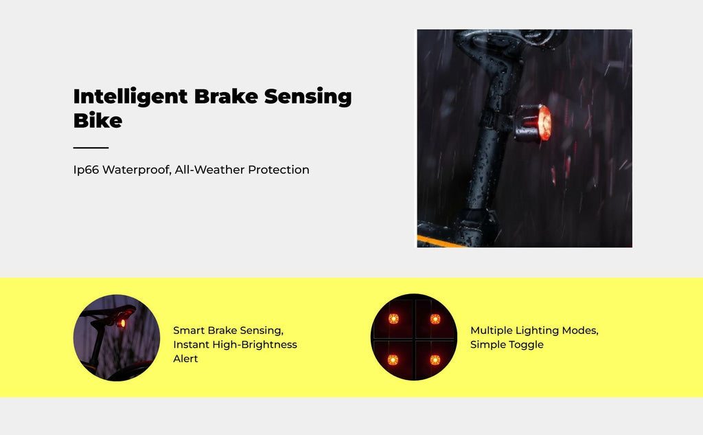 【Smart Brake Sensing Bike】This accessory combines your bike with smart brake sensing technology and an light-emitting diode rear light, providing enhanced and visibility for night cycling, asphalt biking, and trail riding. 【Waterproof and resilient】Featuring an IPX6 waterproof and a vibration-absorbing design, this cycling taillight performs reliably in rainy and foggy weather, offering dependable use in diverse outdoor conditions. 【Multiple Modes & Universal Port Rechargeable】With multiple lighting modes and a universal charging port, this bike rear light delivers versatility for long rides and convenient recharging choices. 【Universal Fit & Easy Installation】Designed for wide compatibility, this bike taillight suits asphalt bikes, trail bikes, and balance bikes. rapid detachment and adjustable angle features ensure simple, secure installation. 【Lightweight and Comfortable】The lightweight construction and silicone pad provide anti-slip and shock-absorbing comfort, ensuring stability and ease during long rides.Specification: