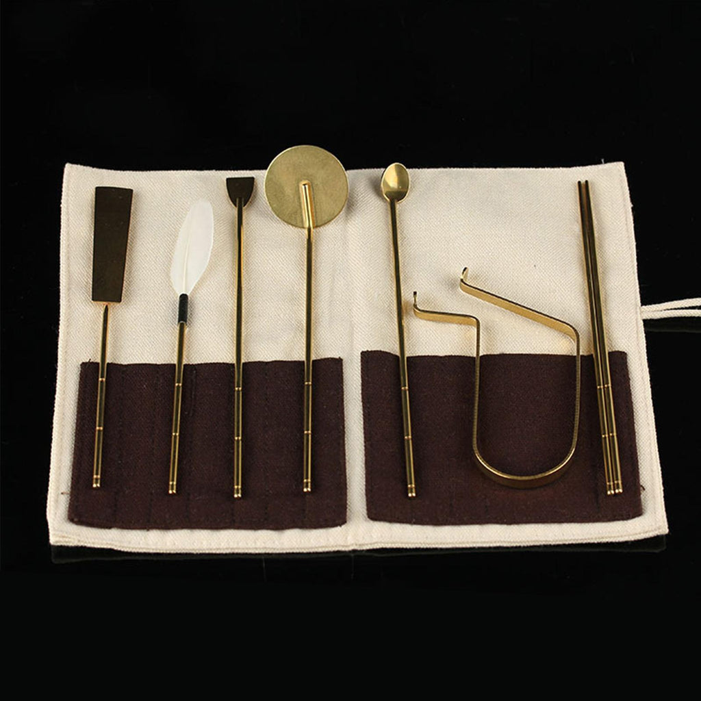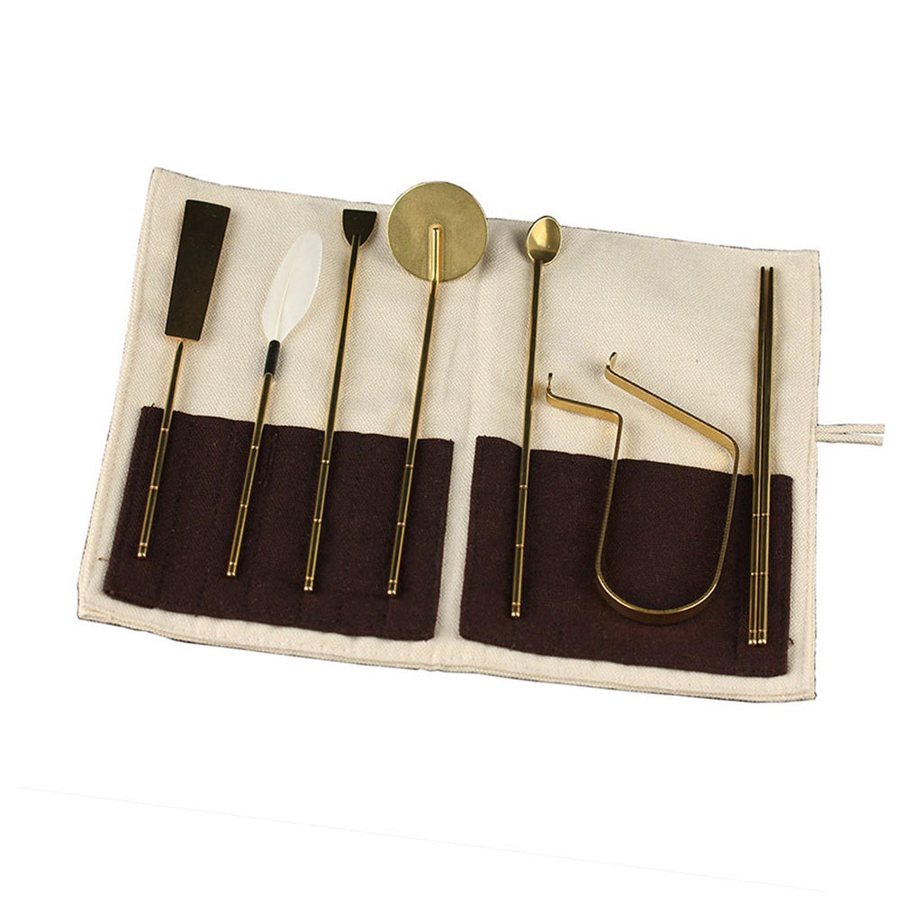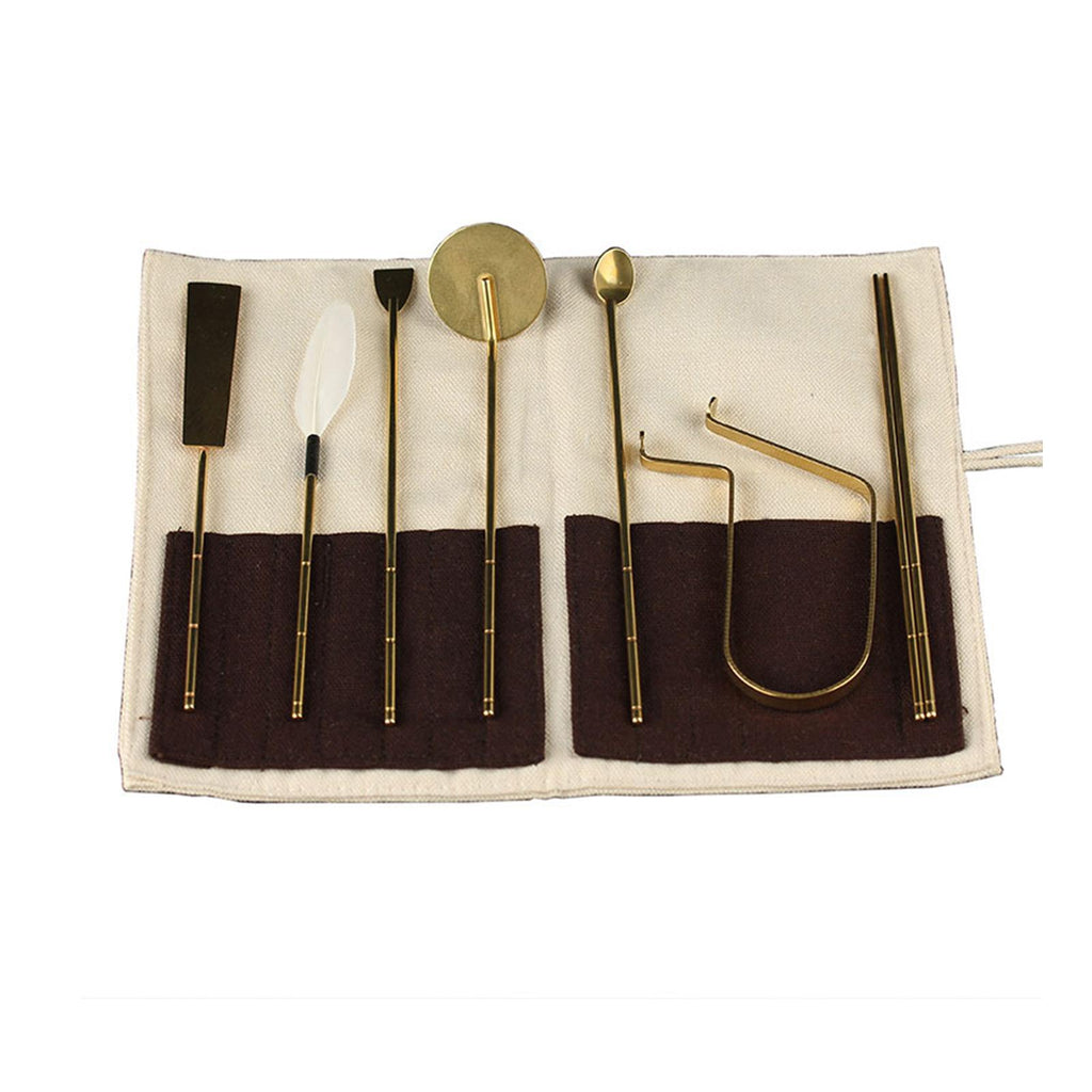 - Brass Incense Tools Kit: 7 Piece Incense Mold Tool, package including Incense Spoon, Ash Board, Feather Sweep, Incense Spatula, Incense Press, Incense Tong, Incense Chopstick .