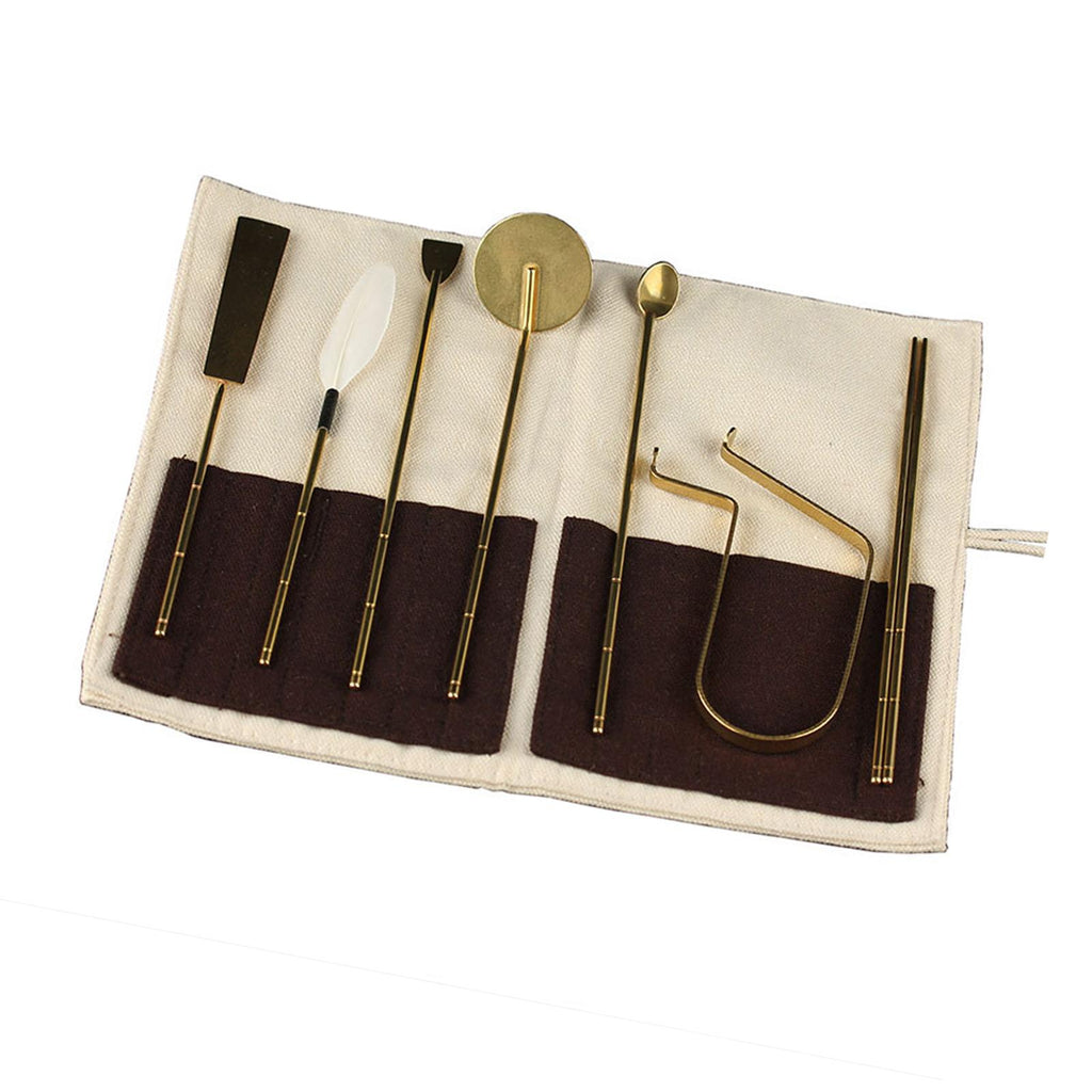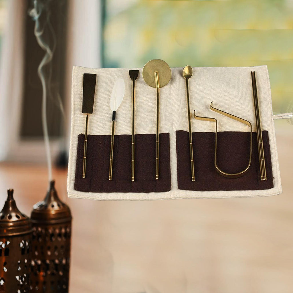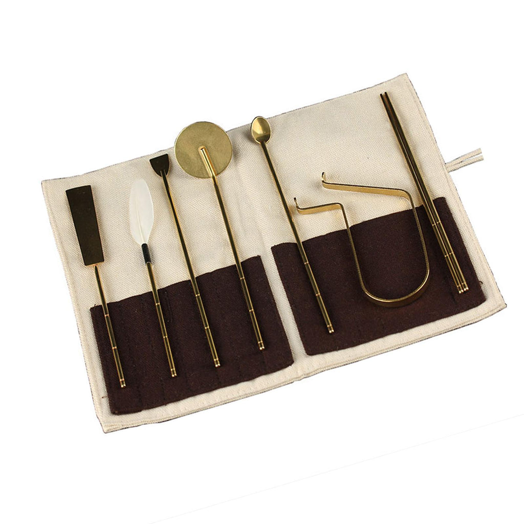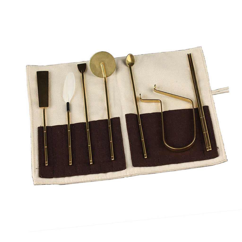 - Brass Incense Tools Kit: 7 Piece Incense Mold Tool, package including Incense Spoon, Ash Board, Feather Sweep, Incense Spatula, Incense Press, Incense Tong, Incense Chopstick .