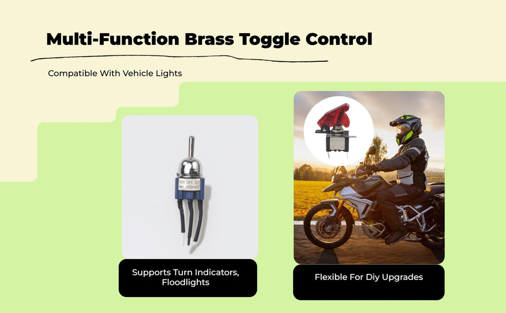 [Resilient Brass Toggle Controller for Motorcycle Modification] This universal brass toggle controller is made with a high-hardness alloy, ensuring wear endurance and long durability for use on most motorcycles, motorbikes, scooters, and ATVs. [Stable On/deactivate Control for headlamps and Turn indicators] Designed for easy installation on 22mm handlebars, this controller provides dependable on/deactivate control for headlamps, turn indicators, and other lighting functions, making it suitable for a variety of riding situations. [Strong Conductivity and debrisResistant Design] Fitted with copper twin-wire cables and an extended wire, this handlebar control delivers conductivity and debris endurance, perfect for aftermarket upgrades and motorcycle customization. [Quick Installation with Mounting Backplate] Prelinked for convenience, the included mounting backplate allows for quick and secure installation, fitting 22mm (7/8 inch) handlebars and compatible with most motorcycle style S. [Versatile Application for Multiple Vehicles] Perfect for motorcycles, electric bikes, scooters, bicycles, and ATVs, this brass-finish toggle controller is a practical option for riders who value durability and stable connections.Specification: