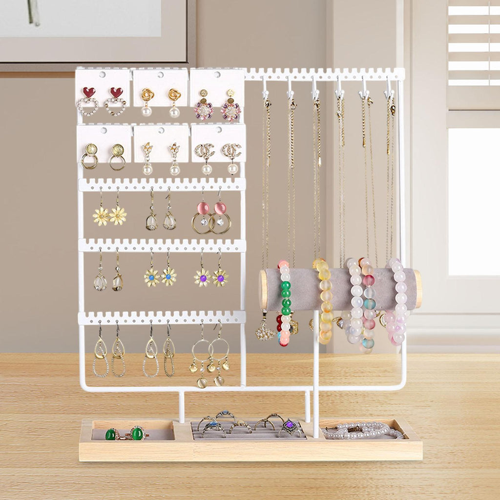 - 【Multipurpose Storage rack】Necklace Earring Stand comes with wooden tray, earring holes and hooks, necklace, bracelet, rings, Earring, bracelet and watch