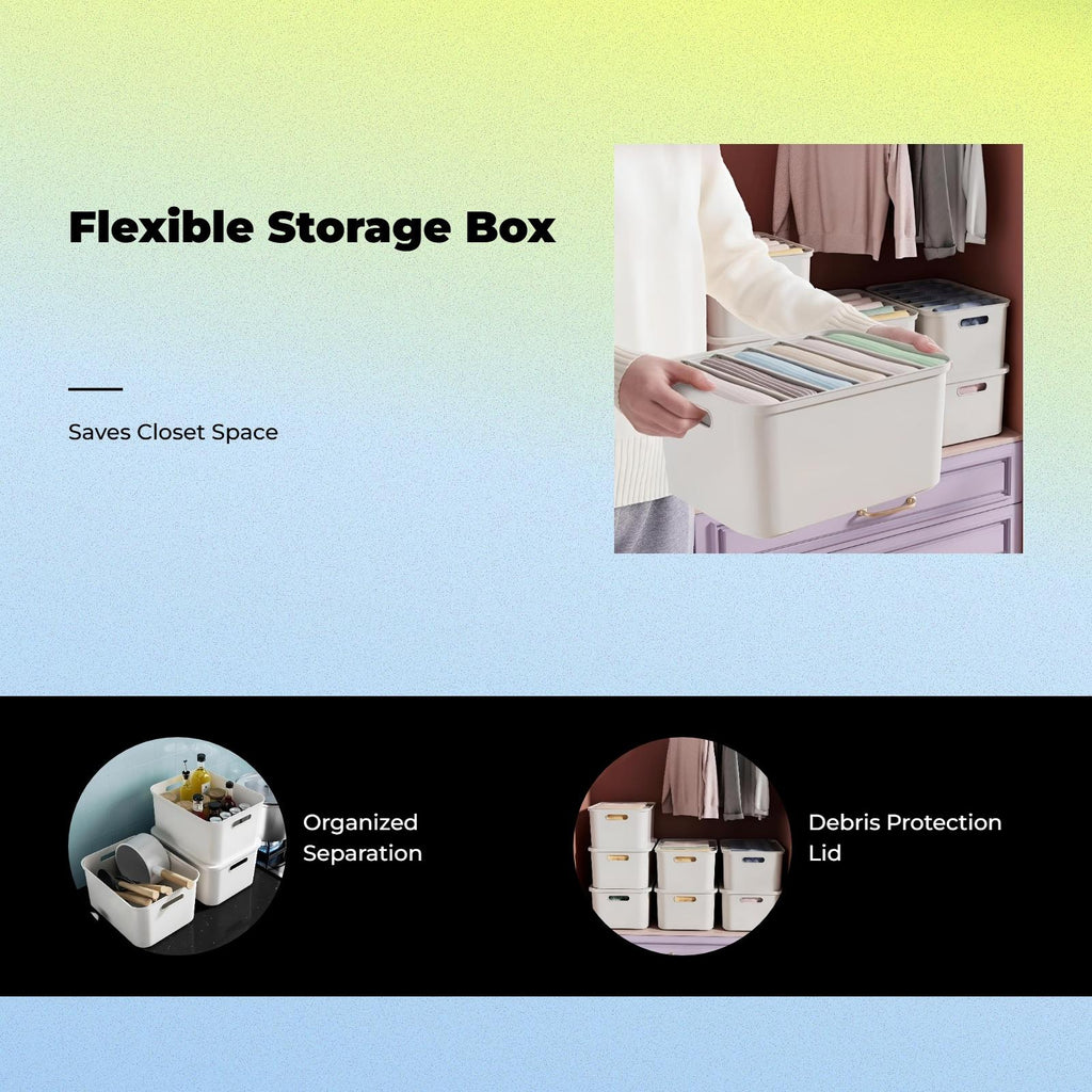 【Adaptable Large Closet Organizer】This stackable storage box with a clear hinged lid is perfect for organizing clothes, pants, and entryories in your wardrobe, bedroom, or laundry room, keeping your space tidy and clean.【High-Quality and Sturdy Material】Made from robust materials, this organizer offers long use, making it perfect for common home storage needs.【Multi-Purpose and Space-Saving】Perfect for closets, dorm rooms, apartments, and living rooms, this storage bin maximizes space and adapts to a variety of storage situations.【Practical Hinged Lid Design】The transparent lid provides easy visibility of the contents while protecting items from particles, ensuring convenient entry and organization.【Easy to Stack and Organize】Designed for stackability, these storage containers efficiently utilize upright space and keep your wardrobe or closet neatly organized.