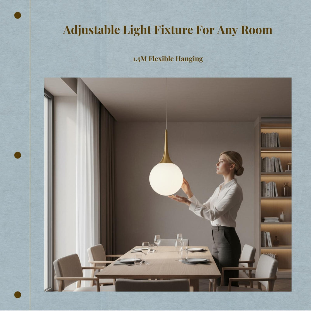 【Modern Milk Cream Globe hanging light Light】This hanging light light features a milk cream glass globe and a gold brass finish, creating a stylish and elegant atmosphere perfect for dining rooms, lounges, and kitchens. Its minimalist Nordic design easily complements a variety of home decor styles.【High-Quality Glass and Brass Construction】Made from milk cream frosted glass and brushed brass, this lighting fixture offers both durability and a sophisticated appearance, making it suitable for long-term use in living rooms, bedrooms, and offices.【Versatile for Various Spaces】Perfect for kitchen islands, dining tables, hallways, and coffee shops, this single-head hanging light light provides soft, diffused lighting, creating a warm atmosphere in any setting.【Adjustable Hanging Height & Easy Installation】The adjustable cord allows for flexible installation at varying heights, making it perfect for staircases, display rooms, and shop entrances. The straightforward installation process saves time and effort.【Energy Efficient and Practical】Compatible with light-emitting diode, incandescent, and energy-saving bulbs (common E27 base, up to 60W, electrical potential 110-220V), this hanging light light offers practical lighting choices for a range of applications.
