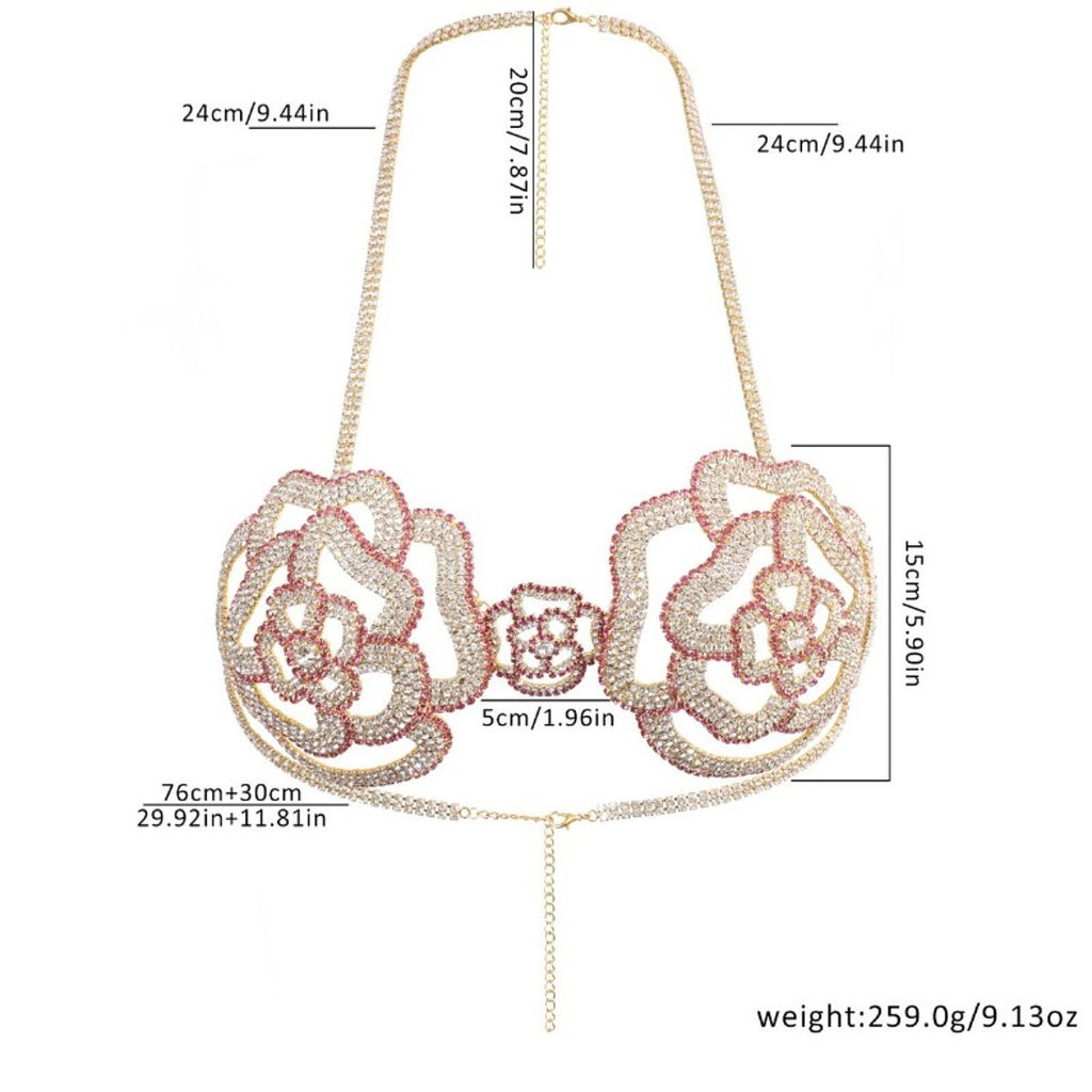 【Product Details】: The rhinestone rose body chain bra measures 106 cm/41.73 inch in length and comes with 1 piece per package, ready to enhance your wardrobe with its glamorous look