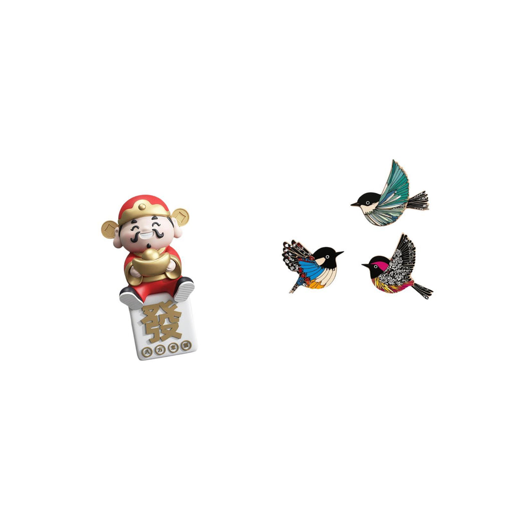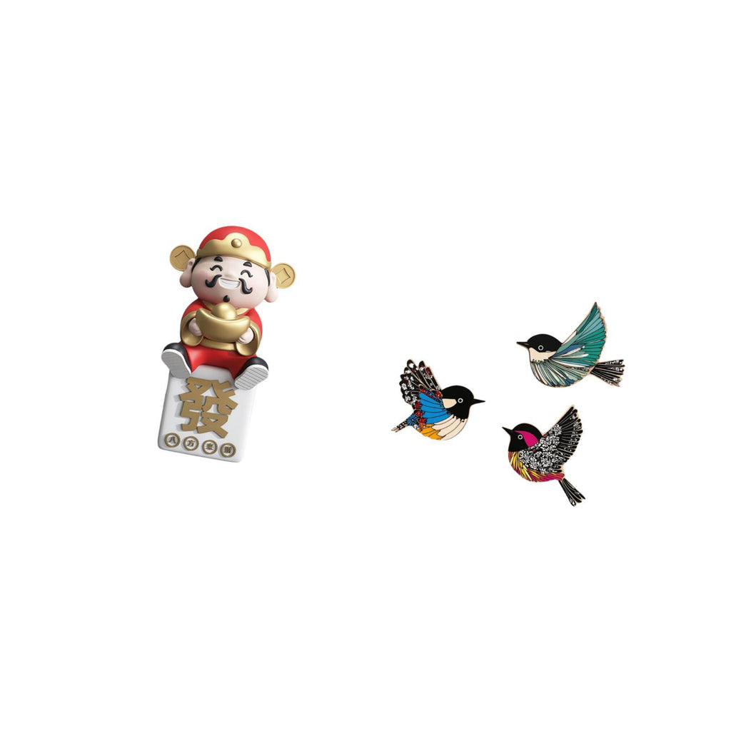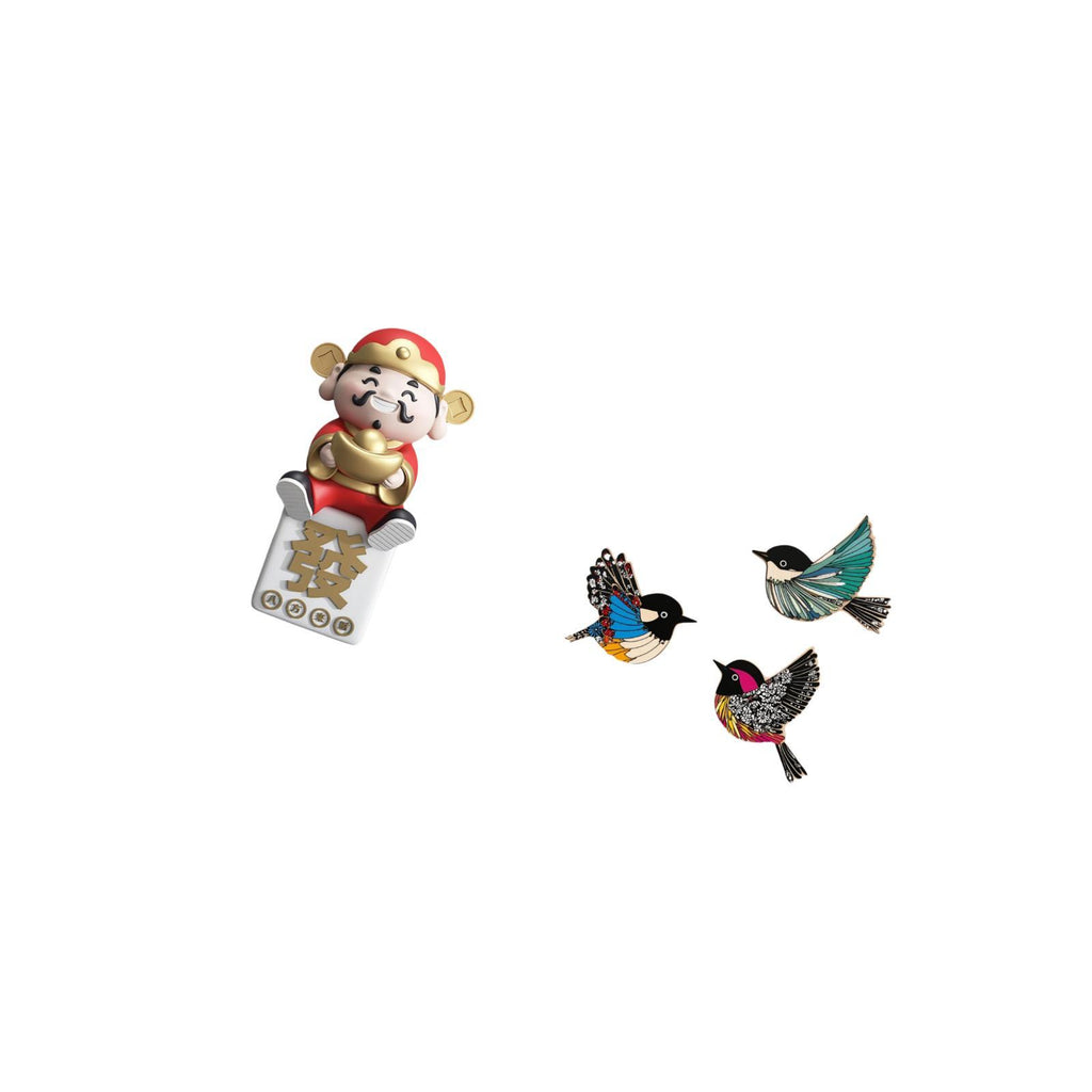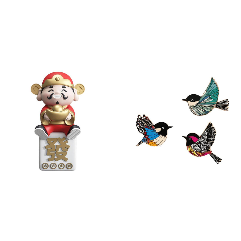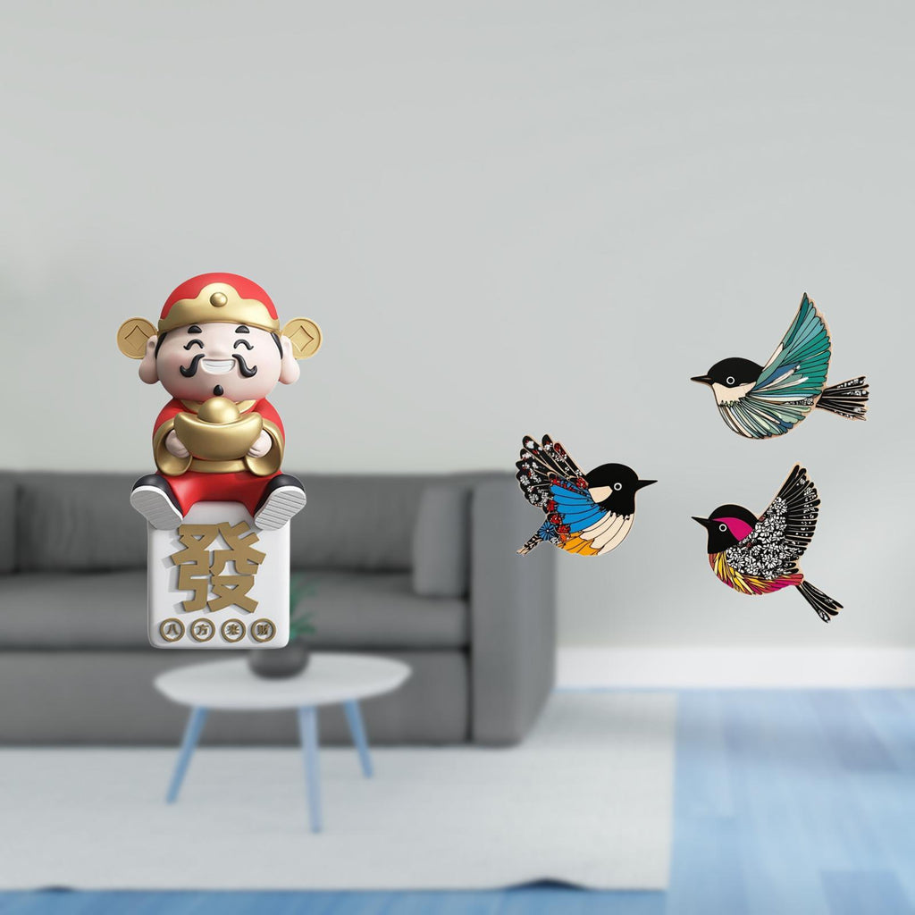 1 God of Fortune Figurine 3 Wooden Bird Wall Decors