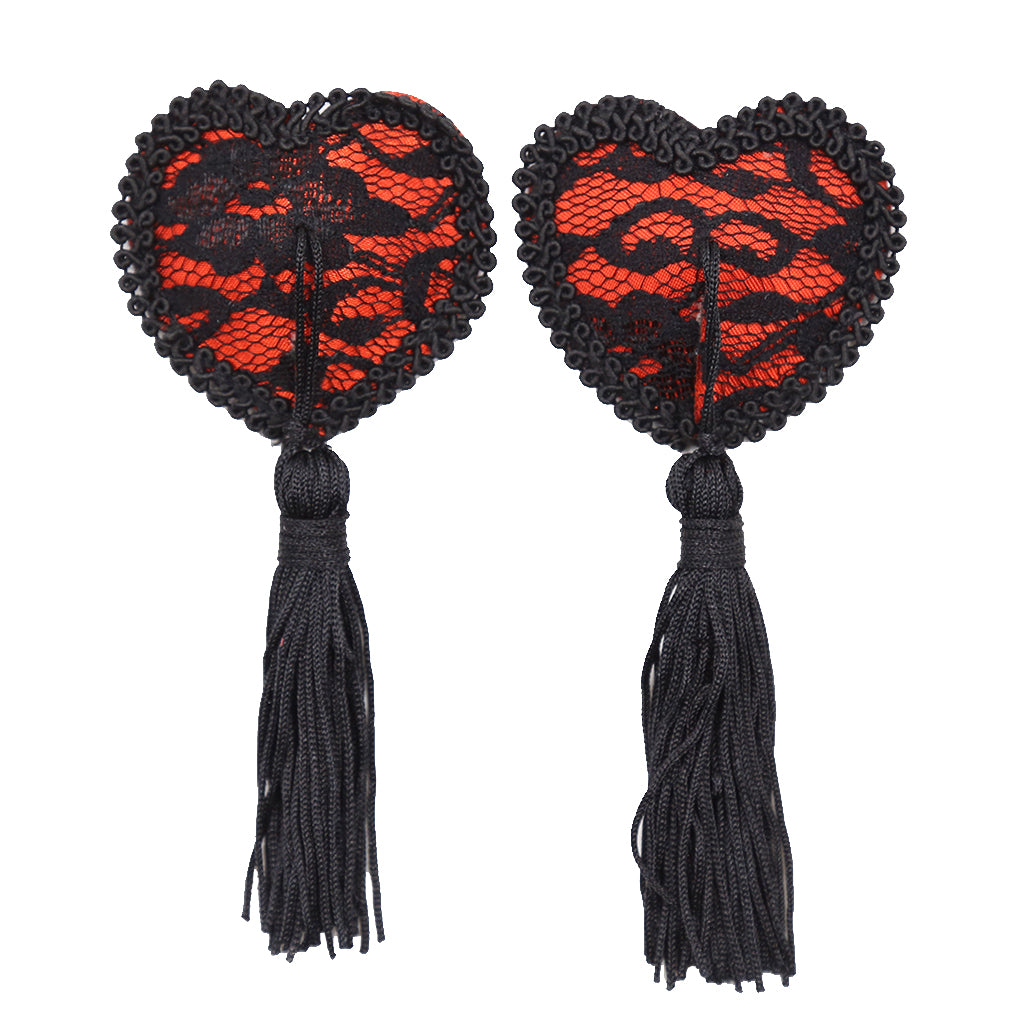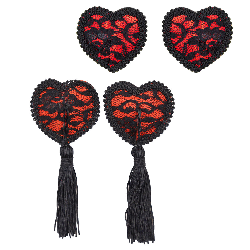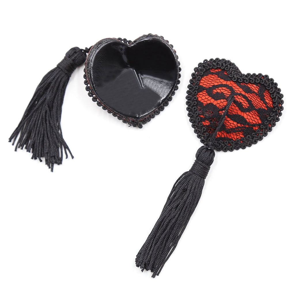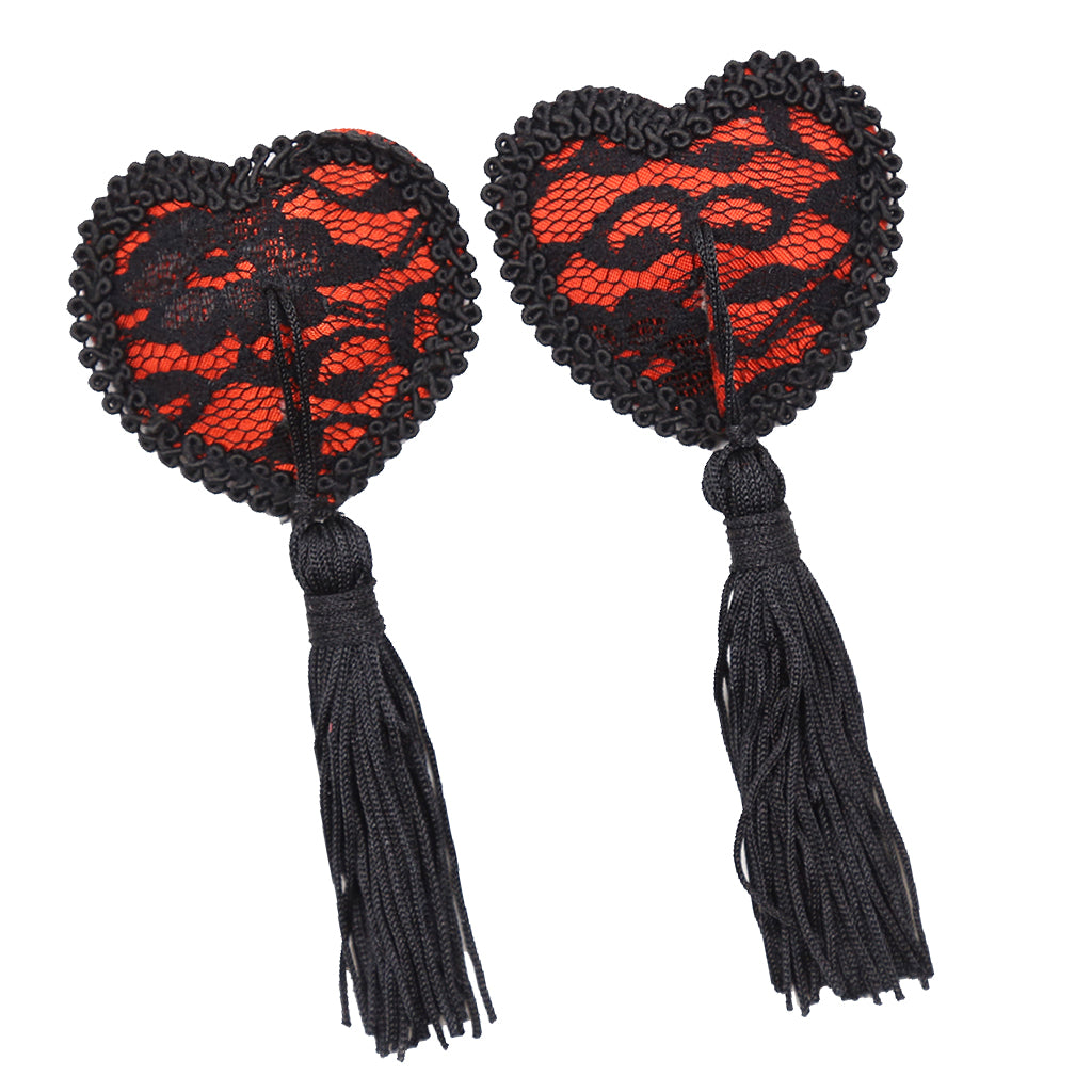 Sexy tasseled lace heart pastes, red and black colored self adhesive nipple cover