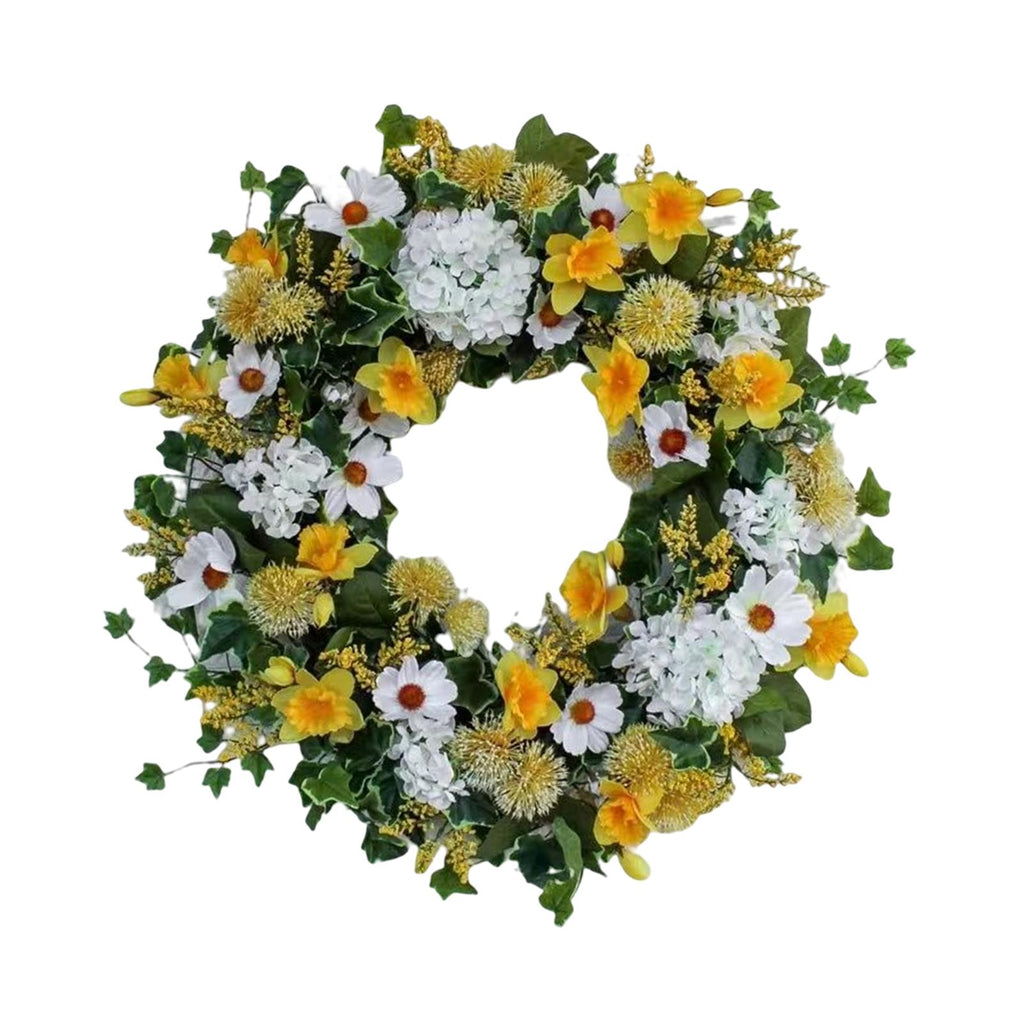 Beautiful Artificial Flower Wreath: Dotted with white flowers, yellow flower, greenery leaves, and comfortable color, Hanging on the front door conspicuously, making your visitor feel the breath of spring.