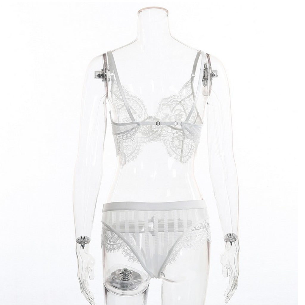 Featuring floral eyelash lace cups with adjustable strappy, back hook and eye closure, matching lace g-string panty.