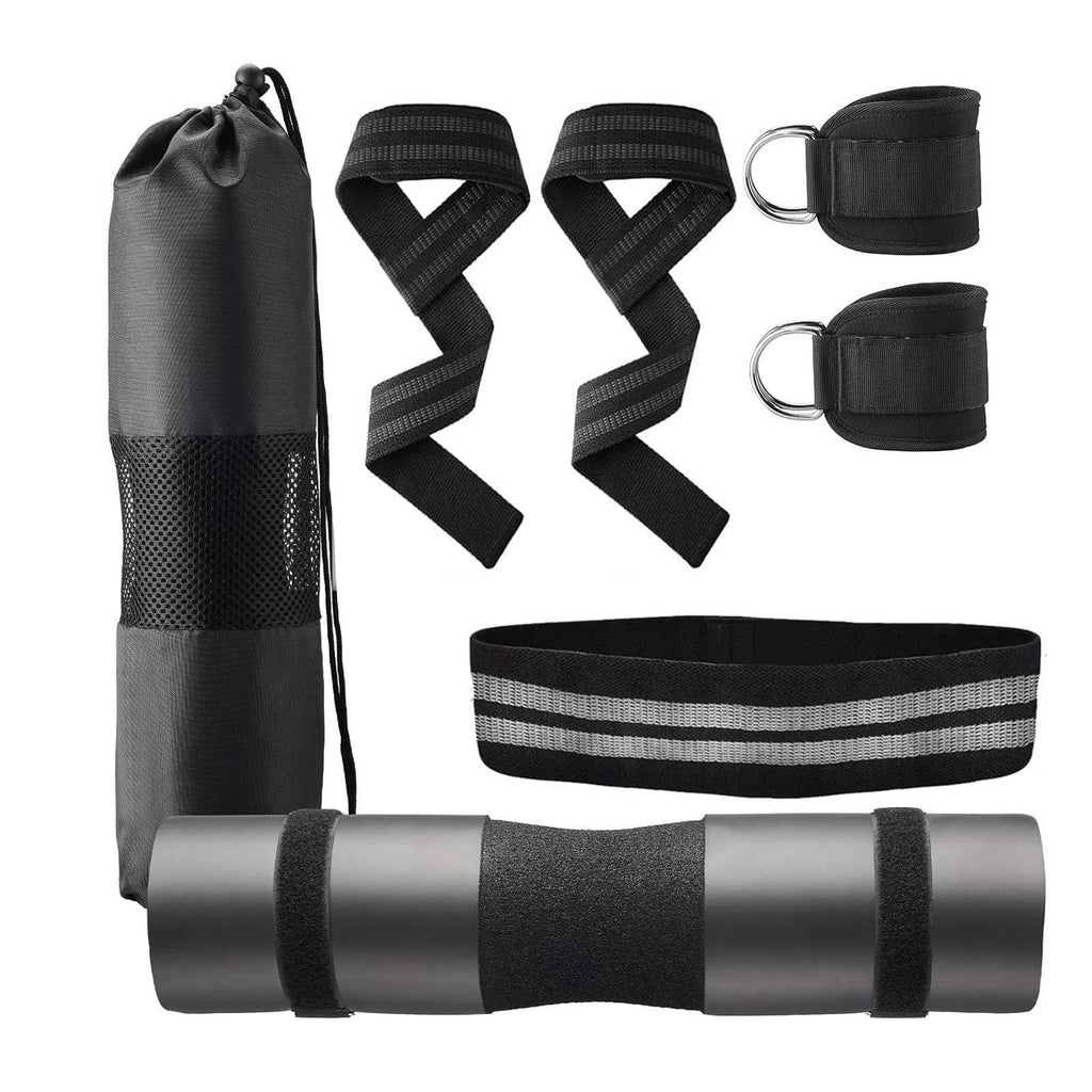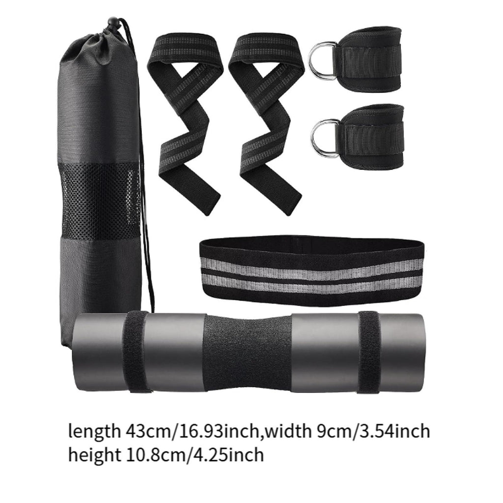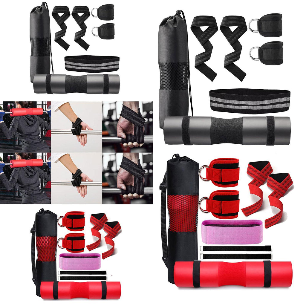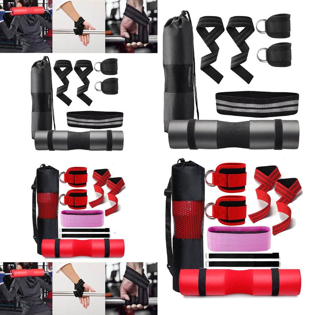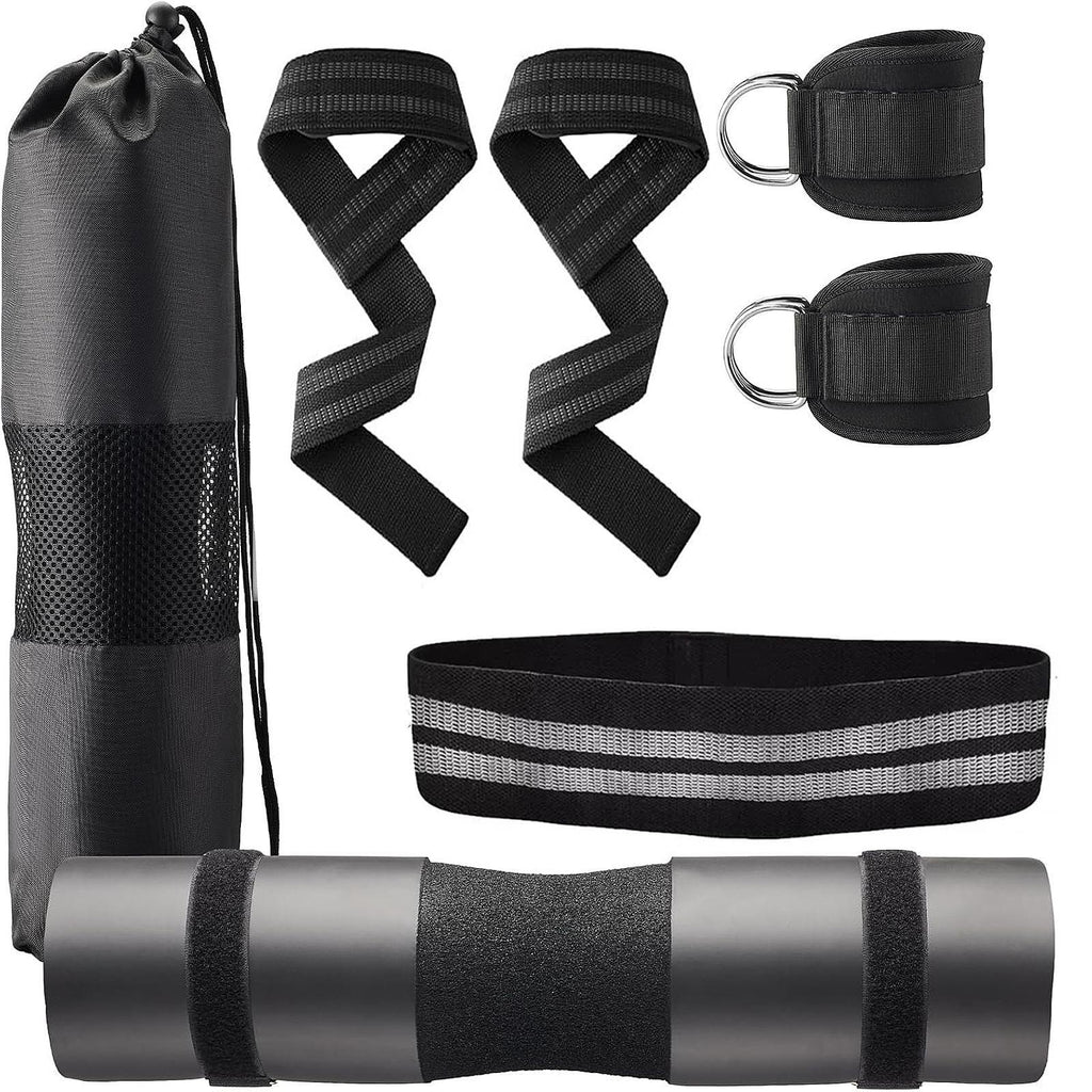 【Versatile Workout Kit】: 1 barbell pad, 2 ankle straps, 1 resistance band, 2 lifting straps, 2 safe straps, and a mesh carry bag, great for strength training, yoga, stretching, and home gym workouts