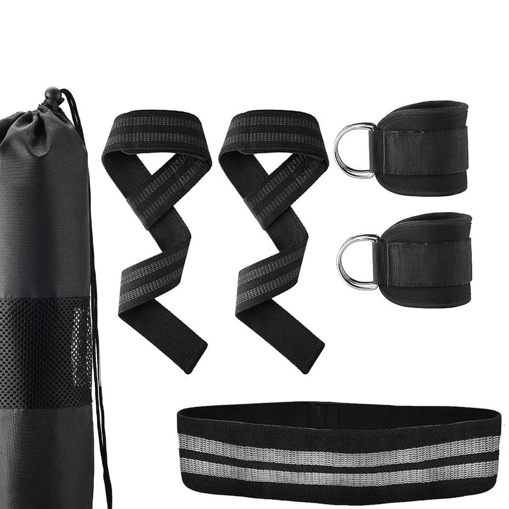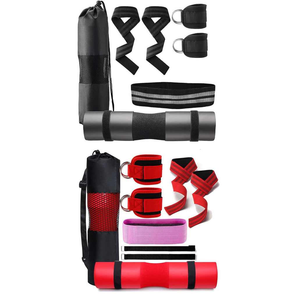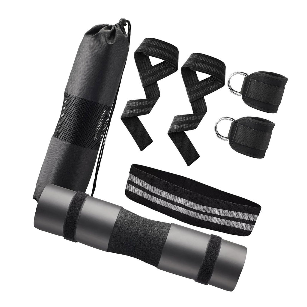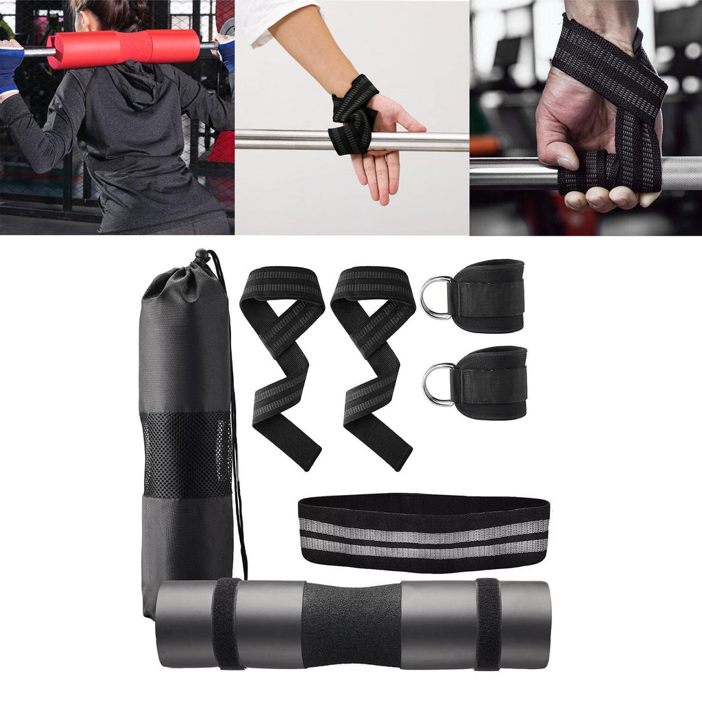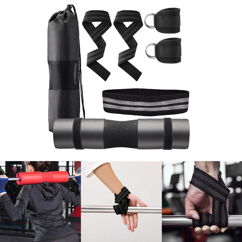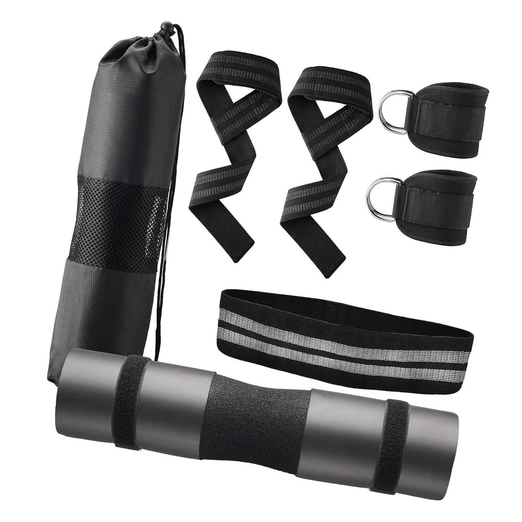 【Versatile Workout Kit】: 1 barbell pad, 2 ankle straps, 1 resistance band, 2 lifting straps, 2 safe straps, and a mesh carry bag, great for strength training, yoga, stretching, and home gym workouts