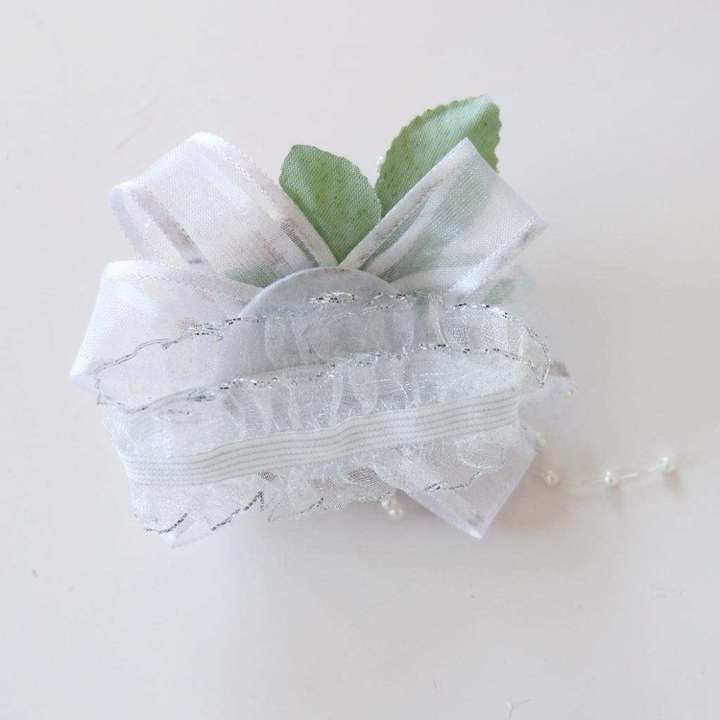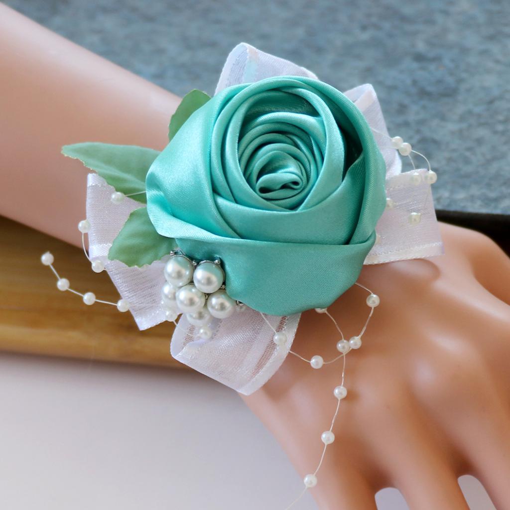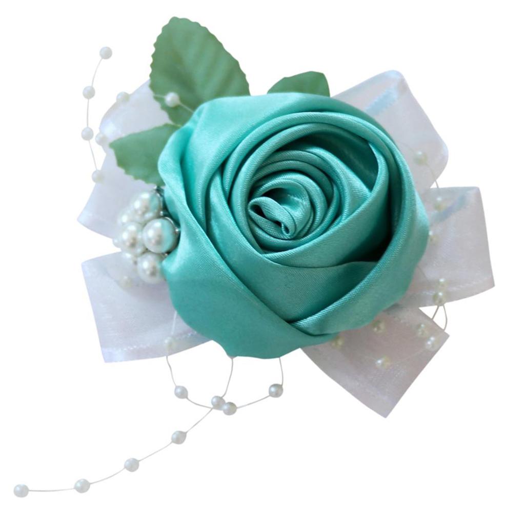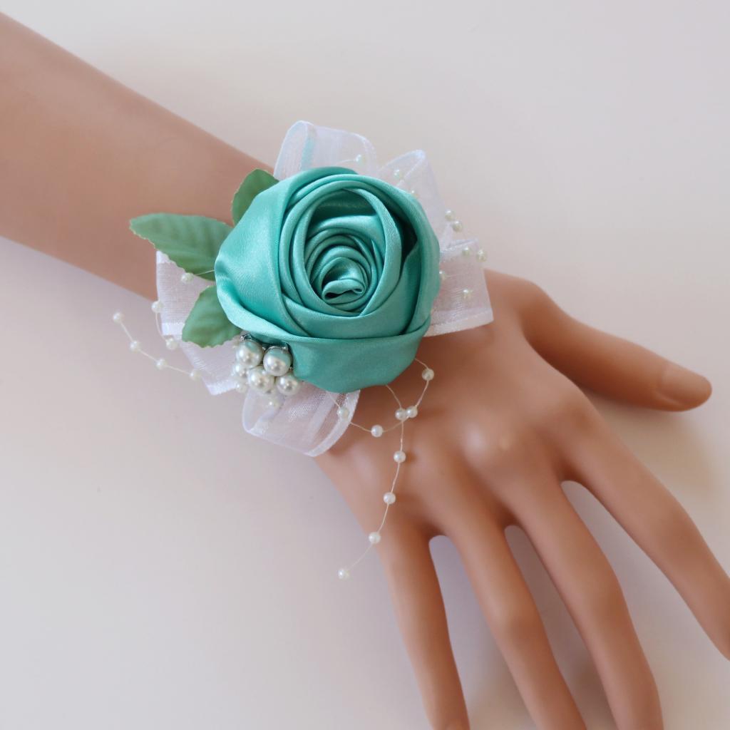 Romantic artificial flower wrist Flowers with pearls decorations and green leaves.