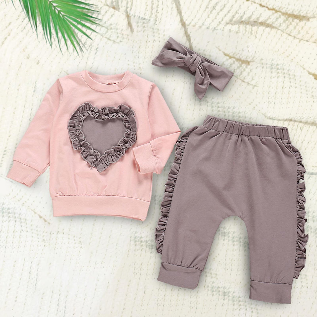 【Feature】: Toddlers Outfit has an elastic waistband for comfort and wear, crewneck love heart pattern sweatshirts, pants with ruffle and bow knot headbands, making your kids more adorable.