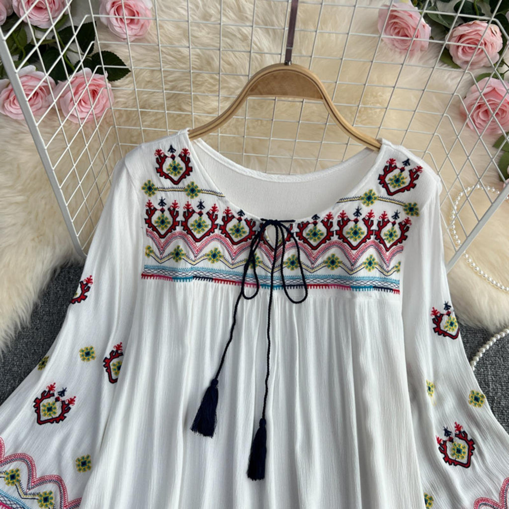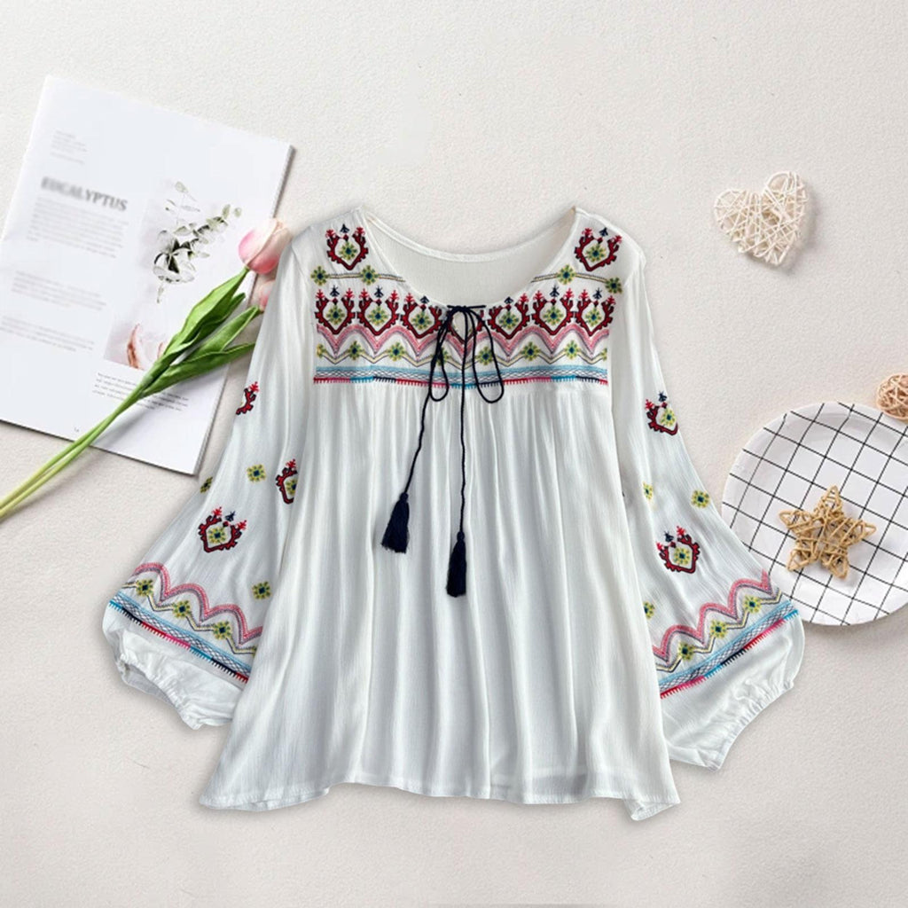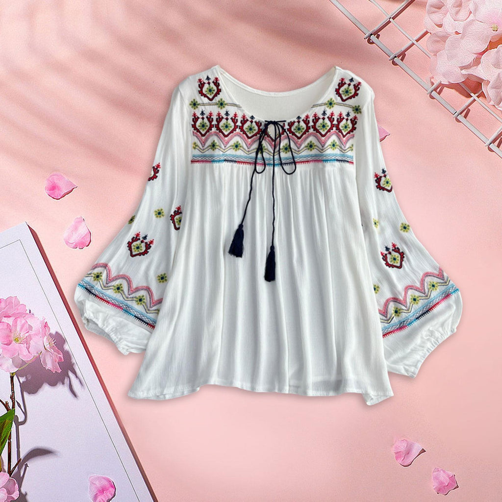 【Dimensions】: Length 56cm/22.05inch, Bust 108cm/42.52inch, Sleeve 54cm/21.26inch. Enhance your wardrobe with this versatile embroidered bohemian blouse