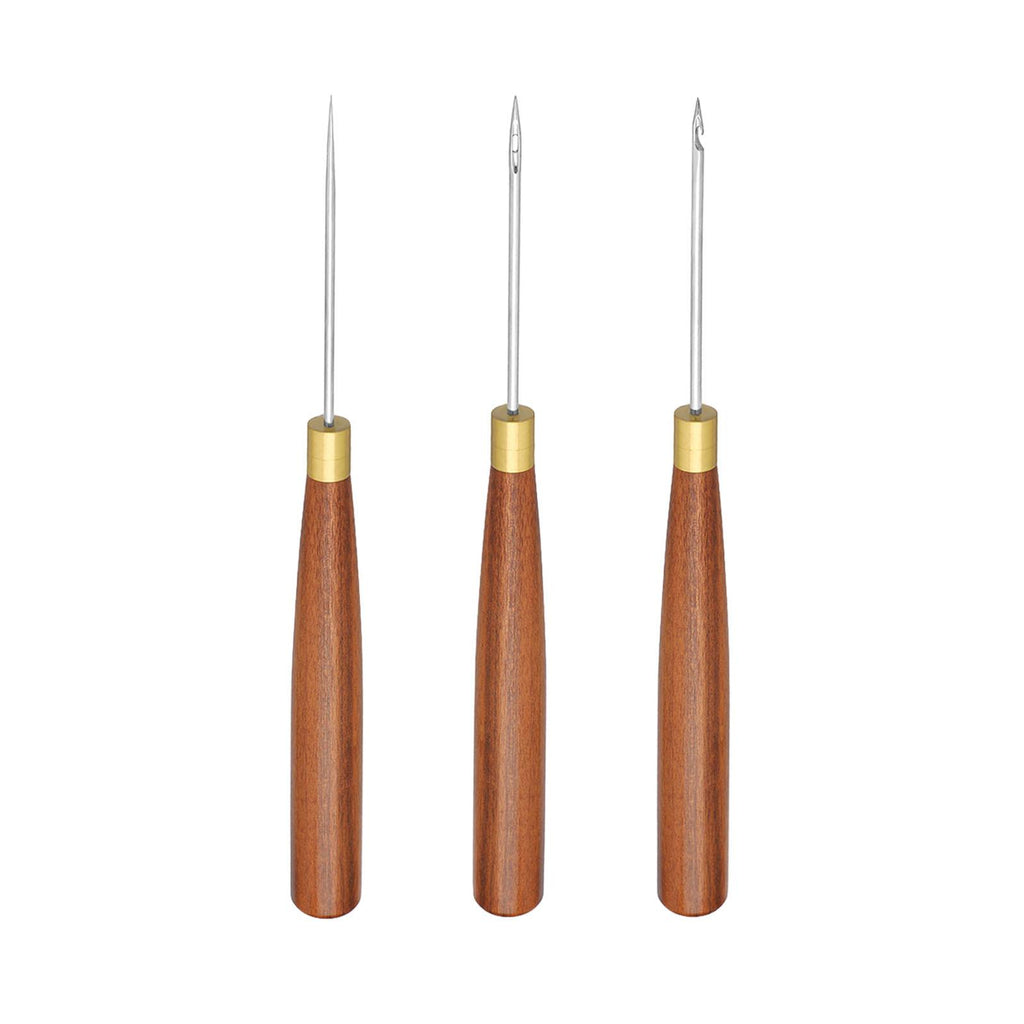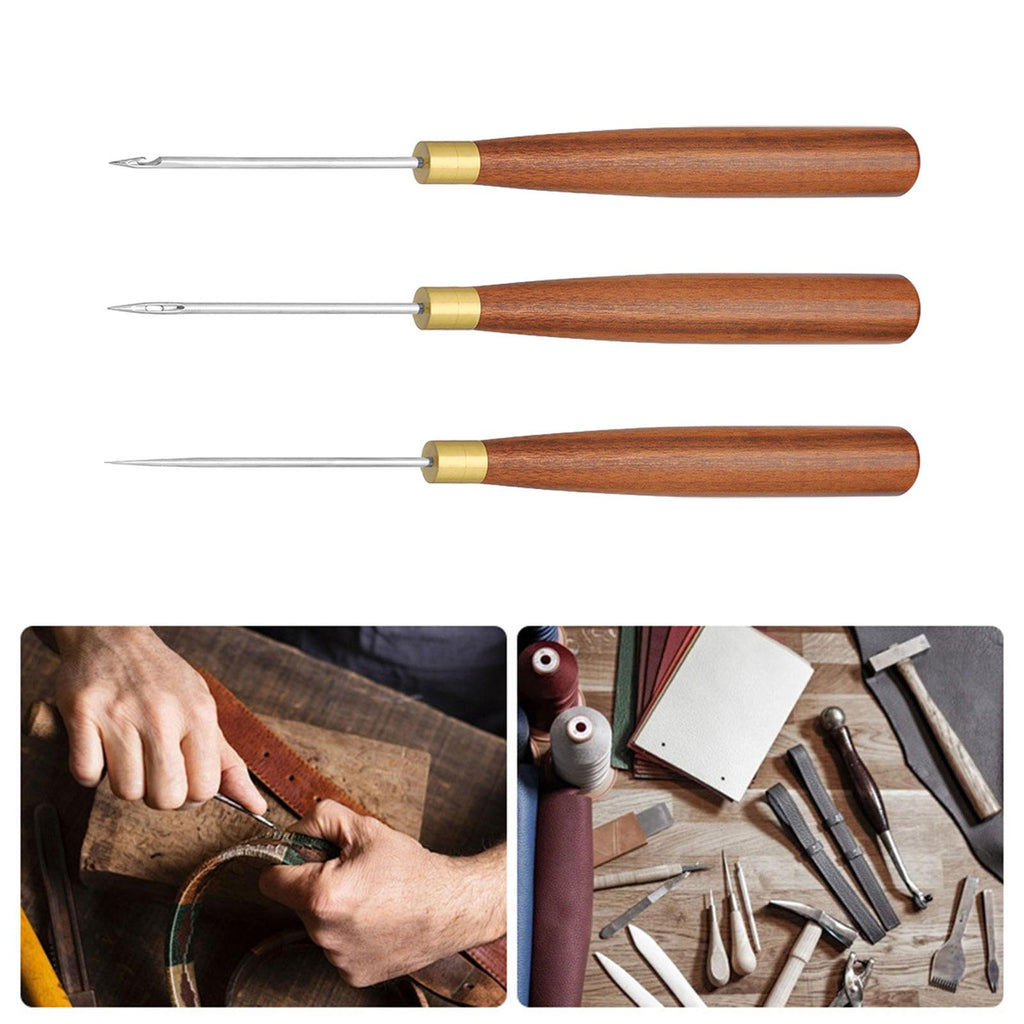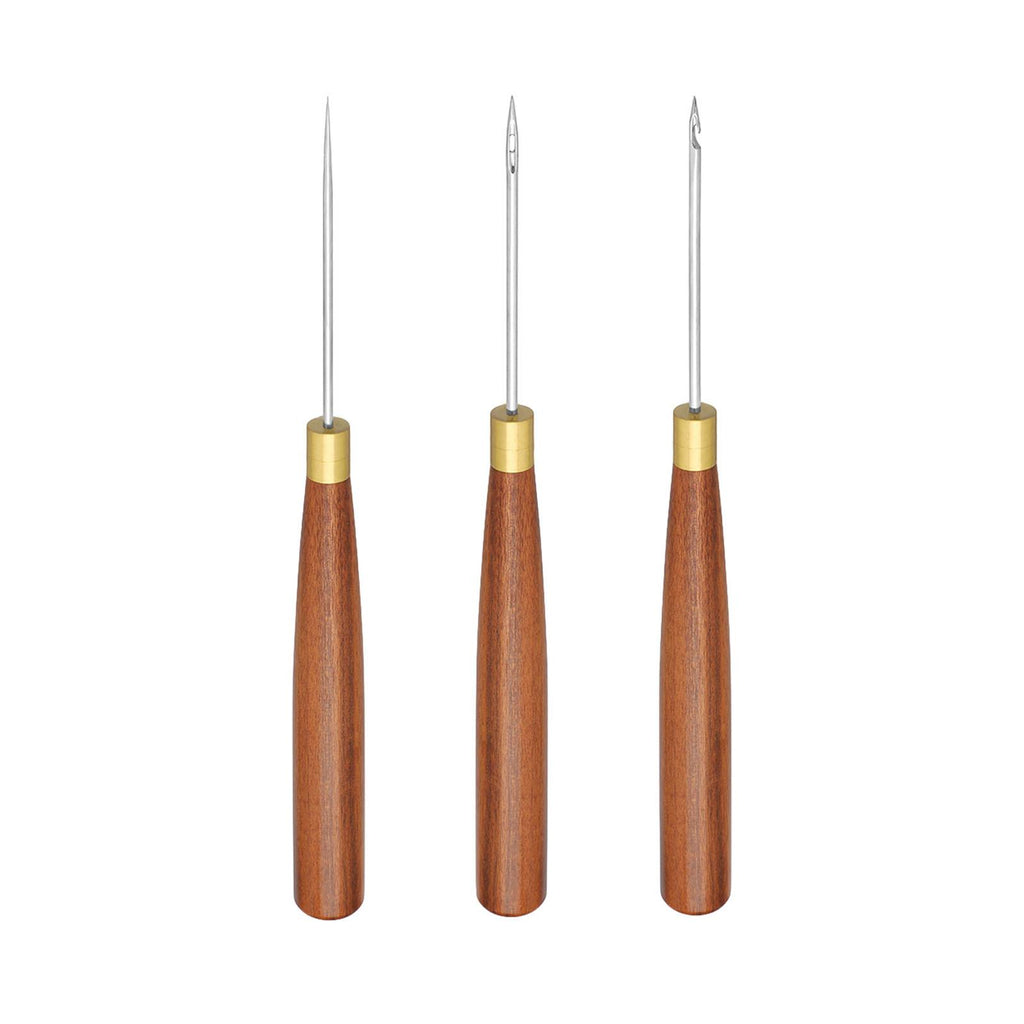 - 【Crafting Set】: Awl Tool includes three essential awls to tackle any project. It includes a straight awl for precise piercing and marking, a hook awl for thread pulling and untying knots, and a hole (sewing) awl for sewing heavy materials like leather and canvas