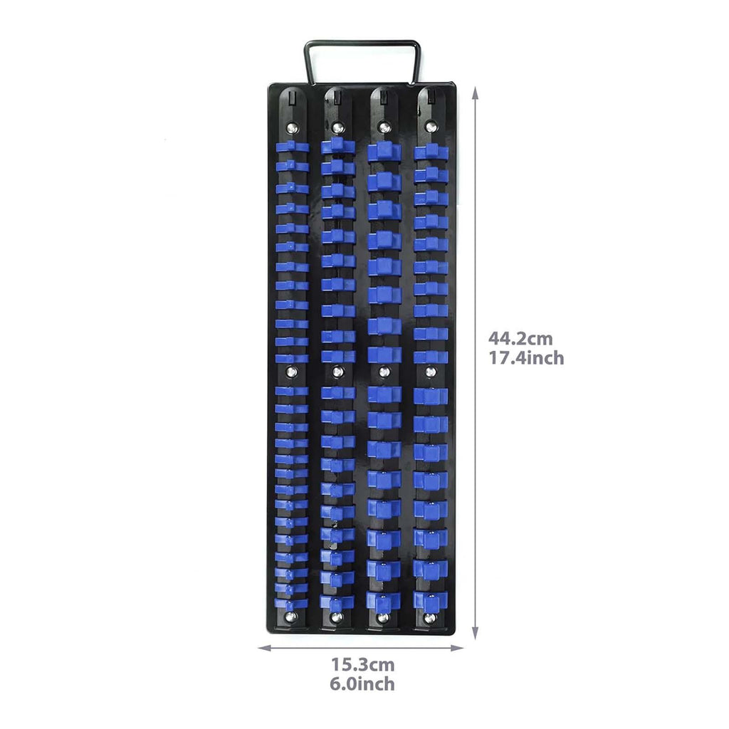 【Compact size】: Socket Holder Clips Rail measures 44.2cmx15.3cm/17.40inchx6.02inch, this organizer fits conveniently into most tool boxes or work space without taking up too much space