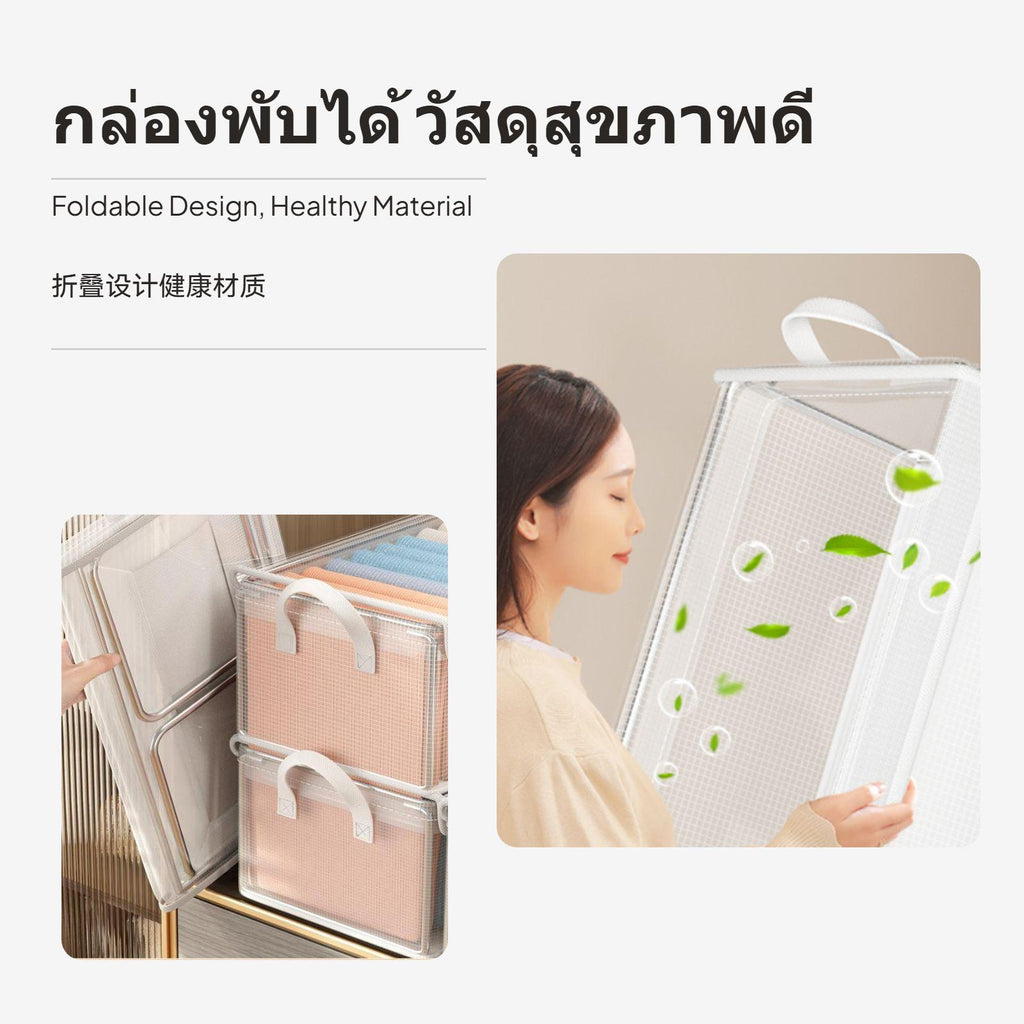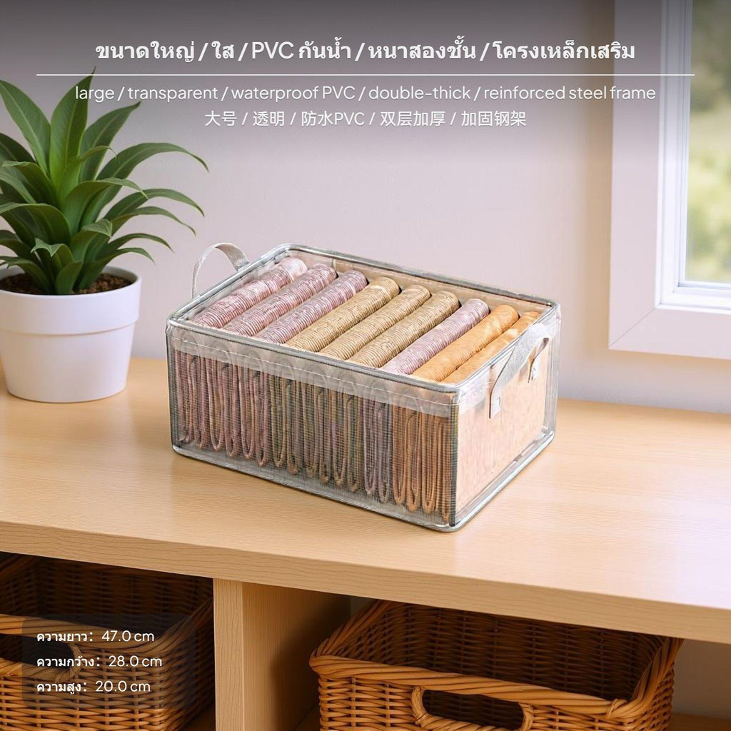 [Clear Visibility and Easy entry] This clothing storage box is designed with a transparent PVC material, allowing you to easily view and retrieve your items at a glance.[sturdy design with Reinforced Frame] Built with a sturdy steel frame and thickened base board, this organizer ensures stability and dependable support, even when stacked in layers.[Foldable and Space-Saving Design] Featuring a foldable construction, this storage box can be easily folded when not in use to save valuable space in your home.[Multi-Purpose Organization] Perfect for storing various items such as t-shirts, sweaters, pants, or assorted goods, making it a adaptable addition to your bedroom or any living space.[Convenient and Portable] Equipped with a practical top handle, this closet organizer organizer is easy to move, helping you efficiently maintain a tidy, organized home.Specification: