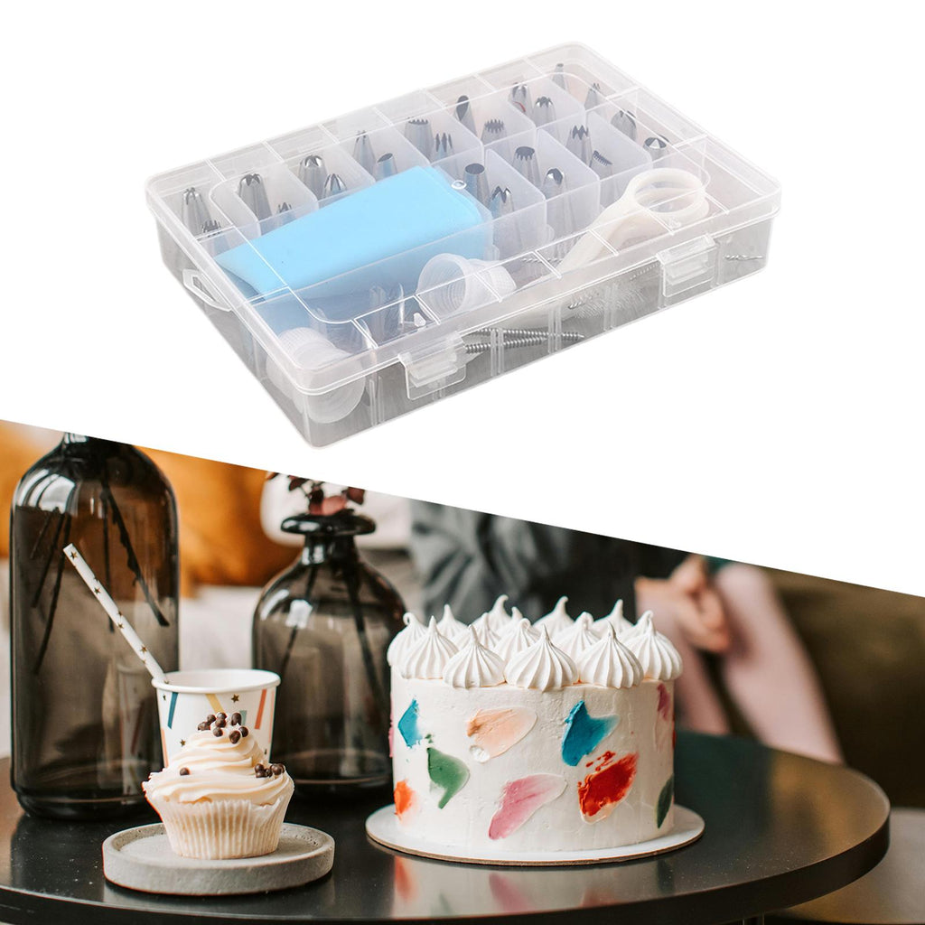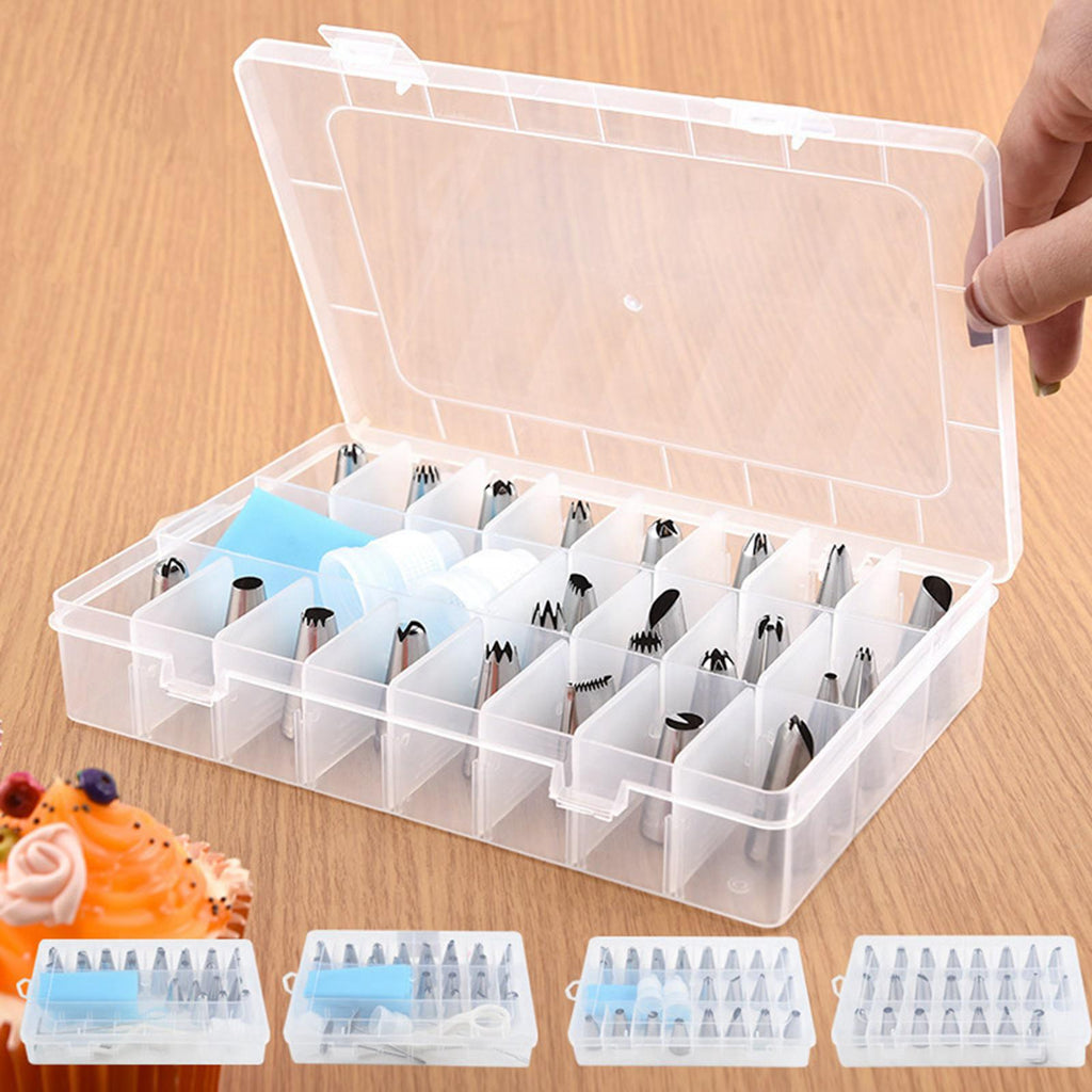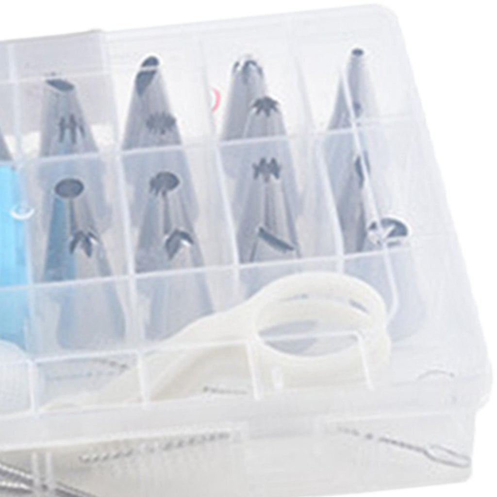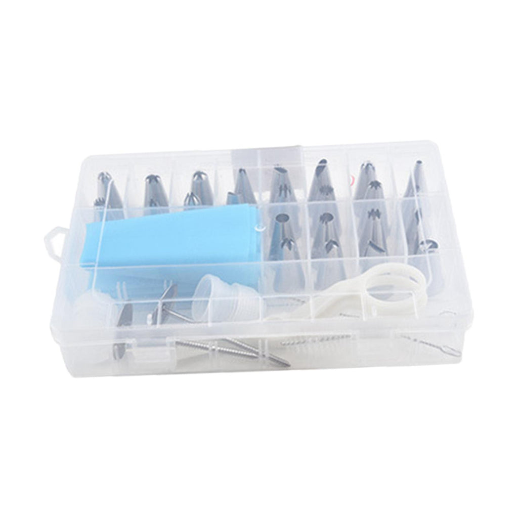 24 Pieces Nozzles Tips 1 Piece Piping Bag 2 Pieces Converter 2 Pieces Decorating Nails 2 Pieces Cleaning Brush 1 Piece Decorating Scissors 1 Piece Storage Box