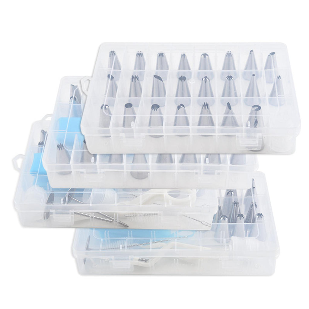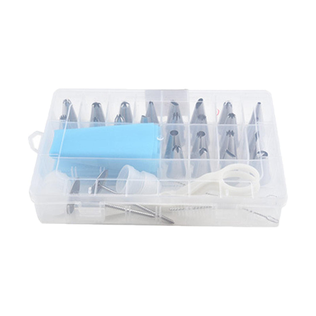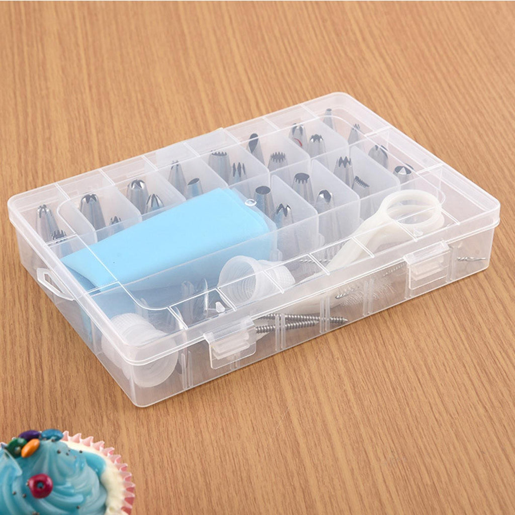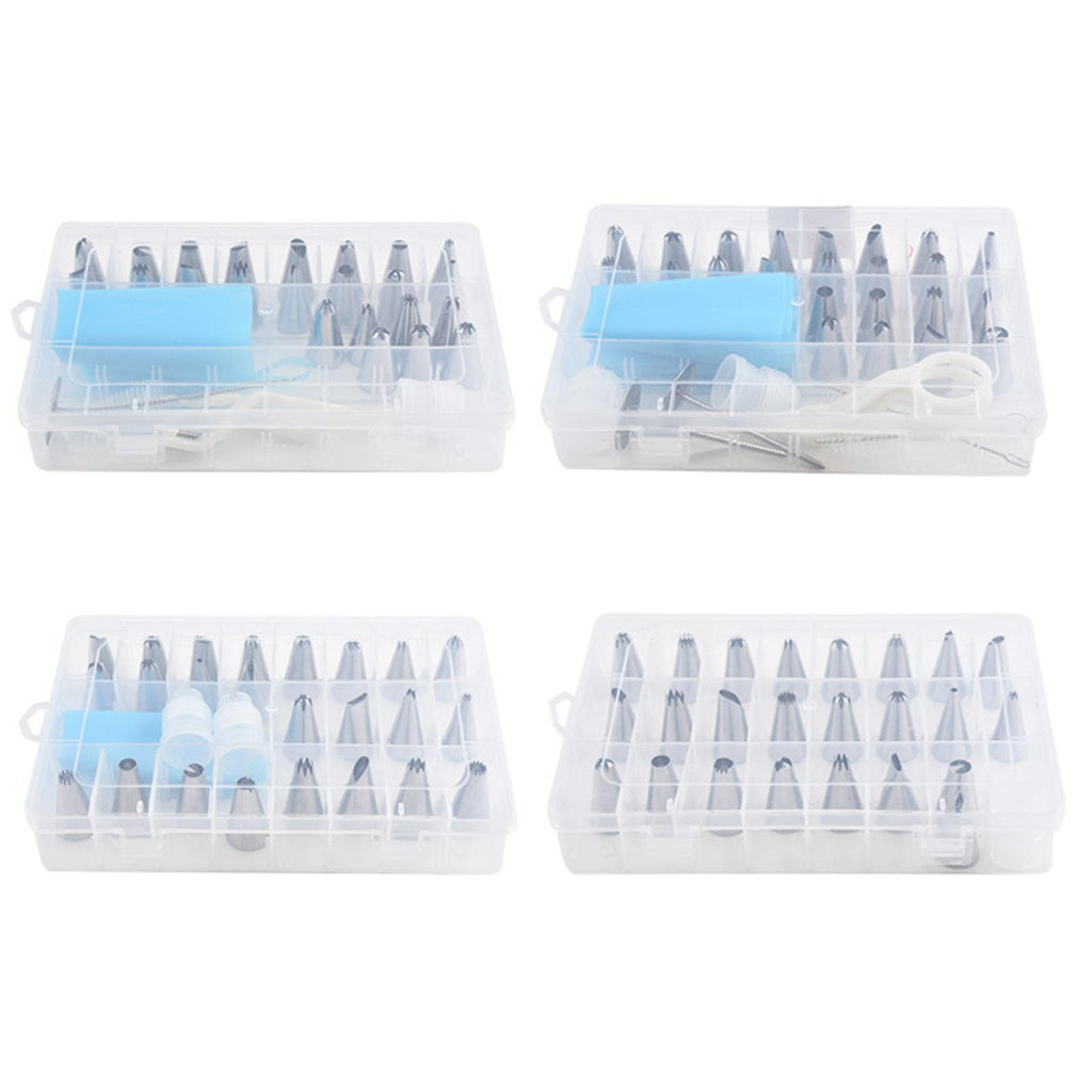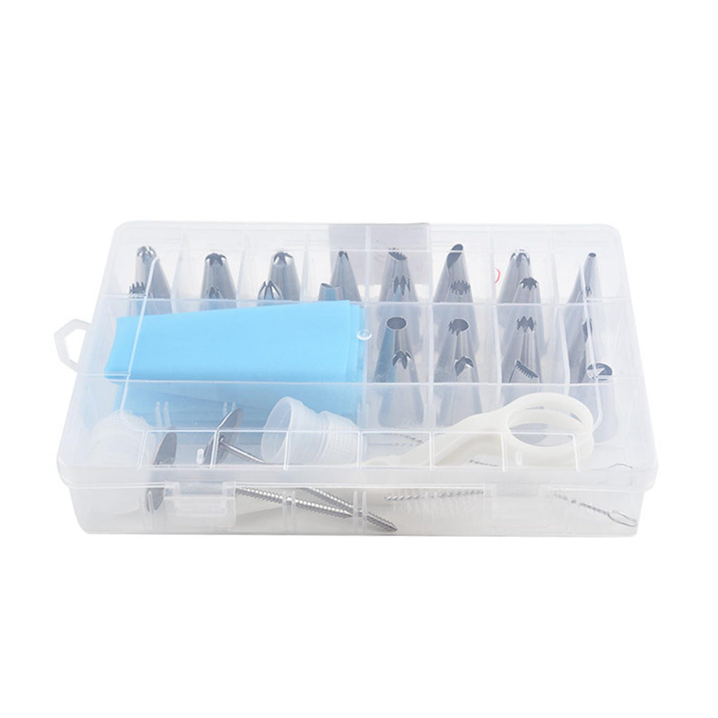 24 Pieces Nozzles Tips 1 Piece Piping Bag 2 Pieces Converter 2 Pieces Decorating Nails 2 Pieces Cleaning Brush 1 Piece Decorating Scissors 1 Piece Storage Box