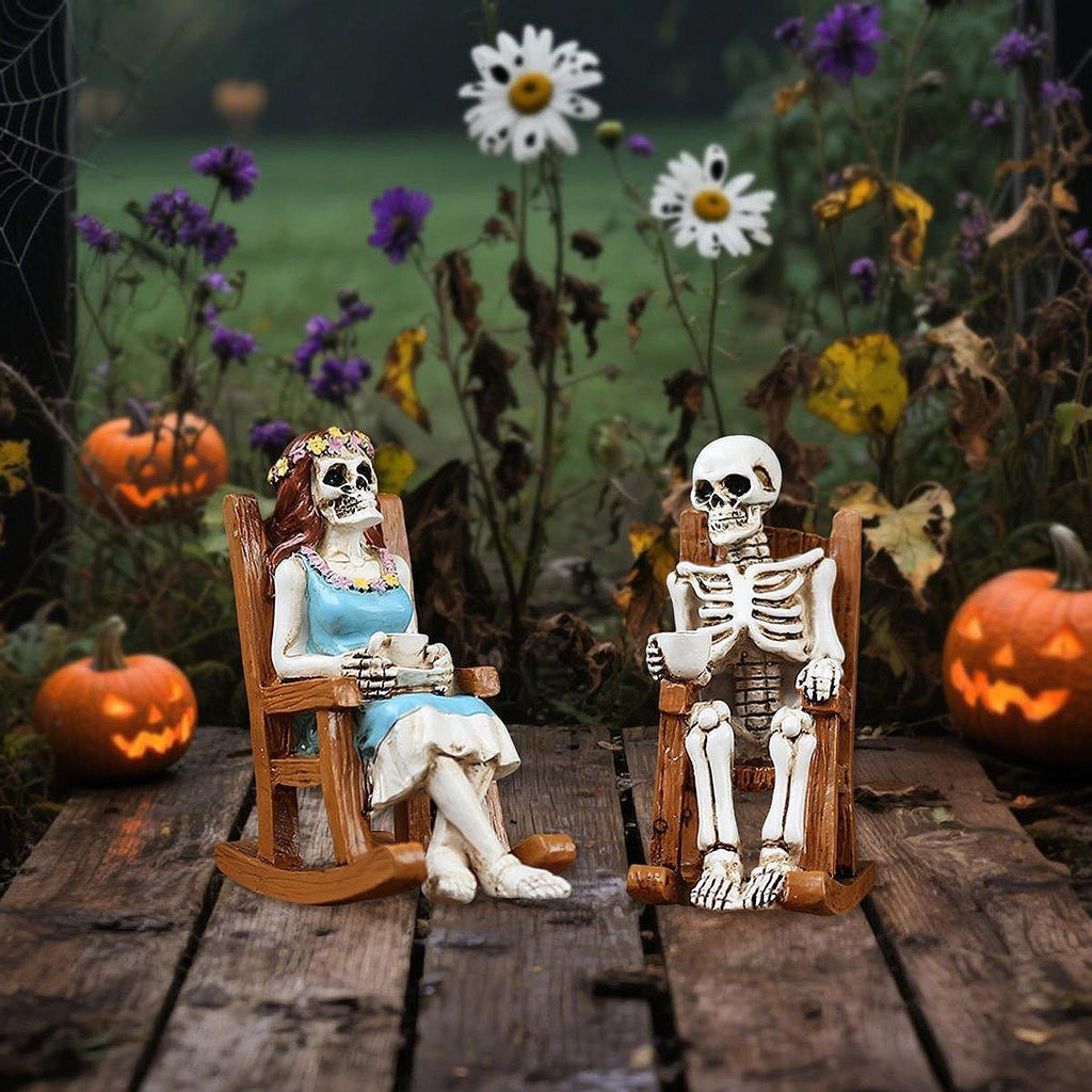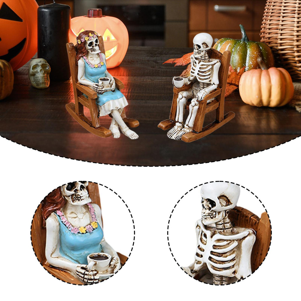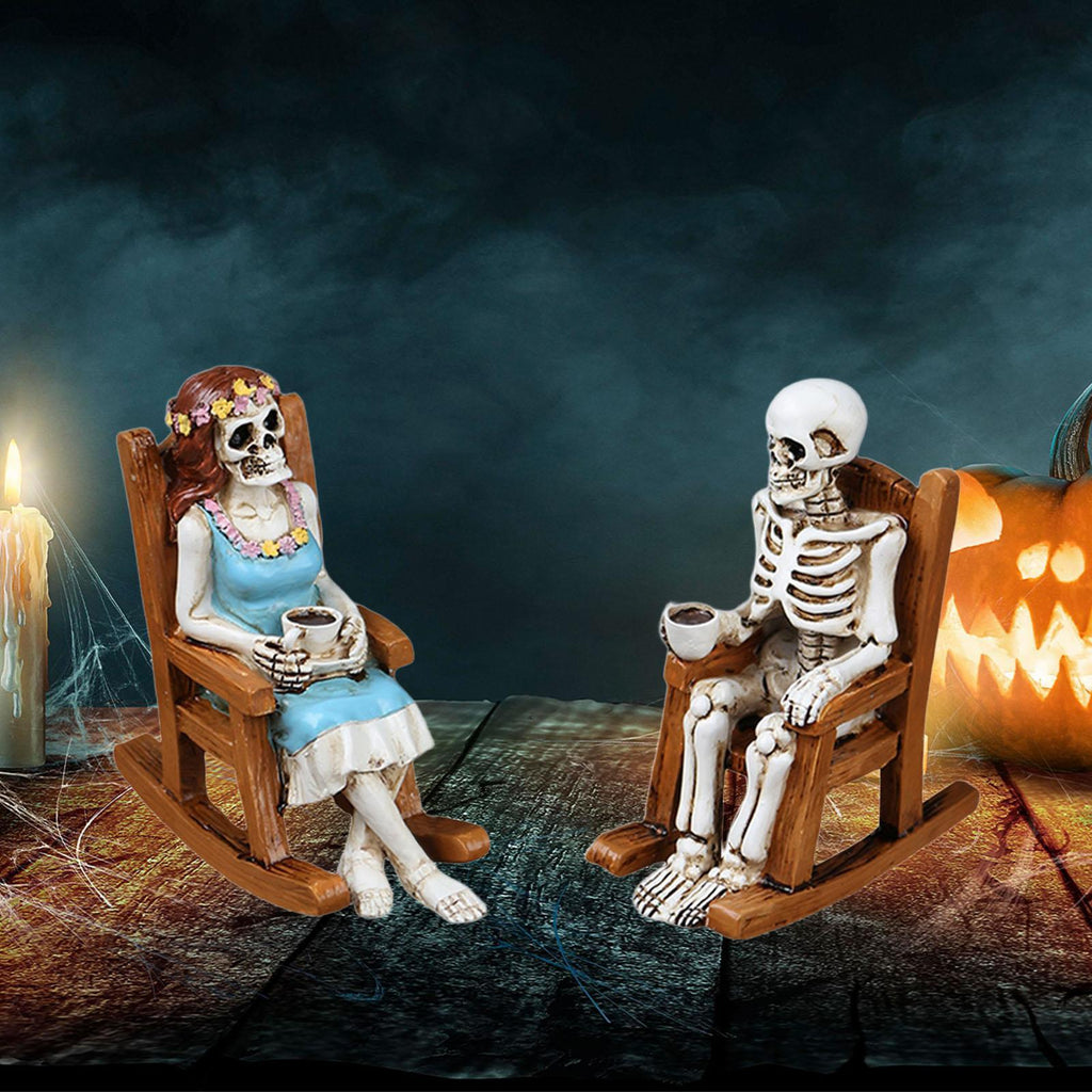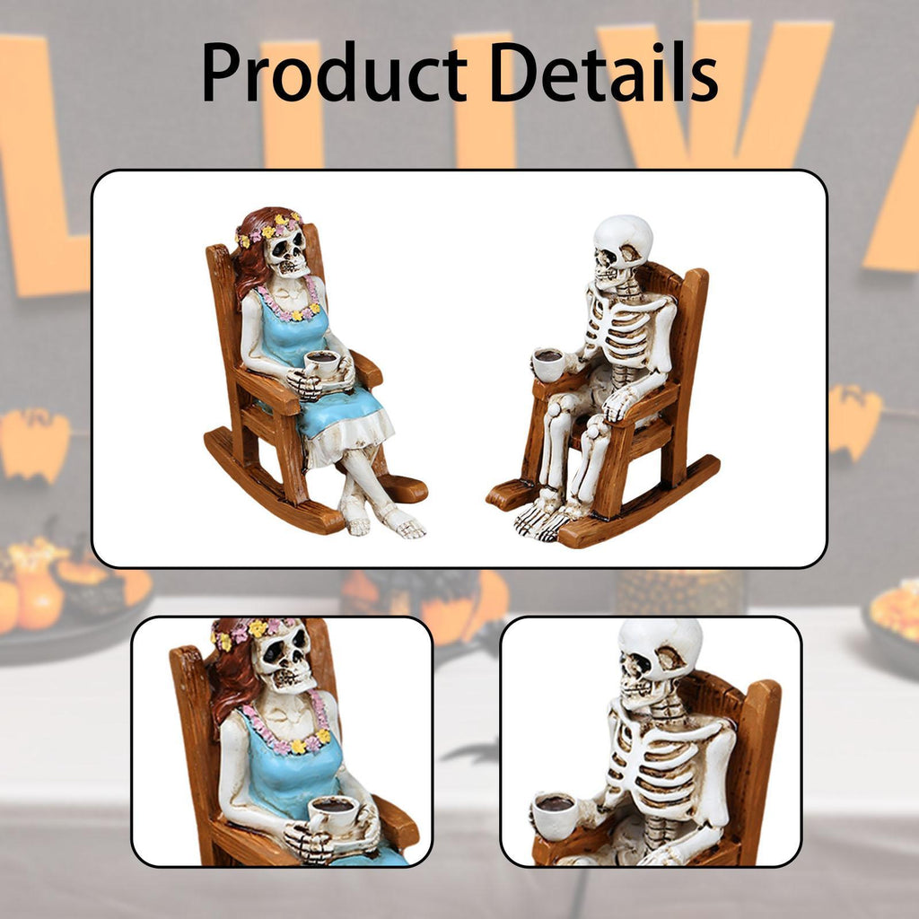 【Halloween Decoration】: 2 pieces of unique skeleton figures figurines stting on rocking chairs with coffee, are nice additions to the haunted house and Halloween decoration, adding a playful and spooky festival atmosphere