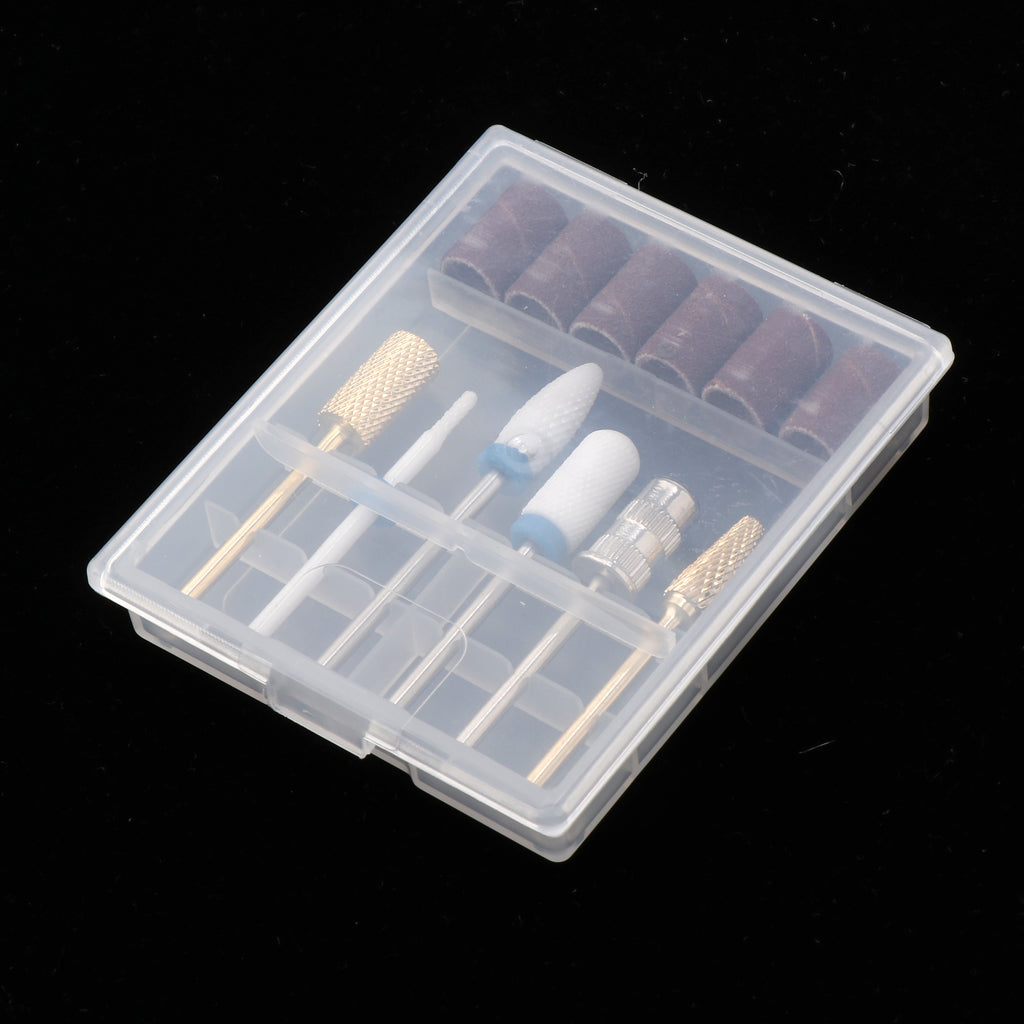 Set of 3/6/10pcs Different Electric Nail Files Drill Bits, 6/7/10 Sanding Bands in different grits and a plastic compact case for storage.