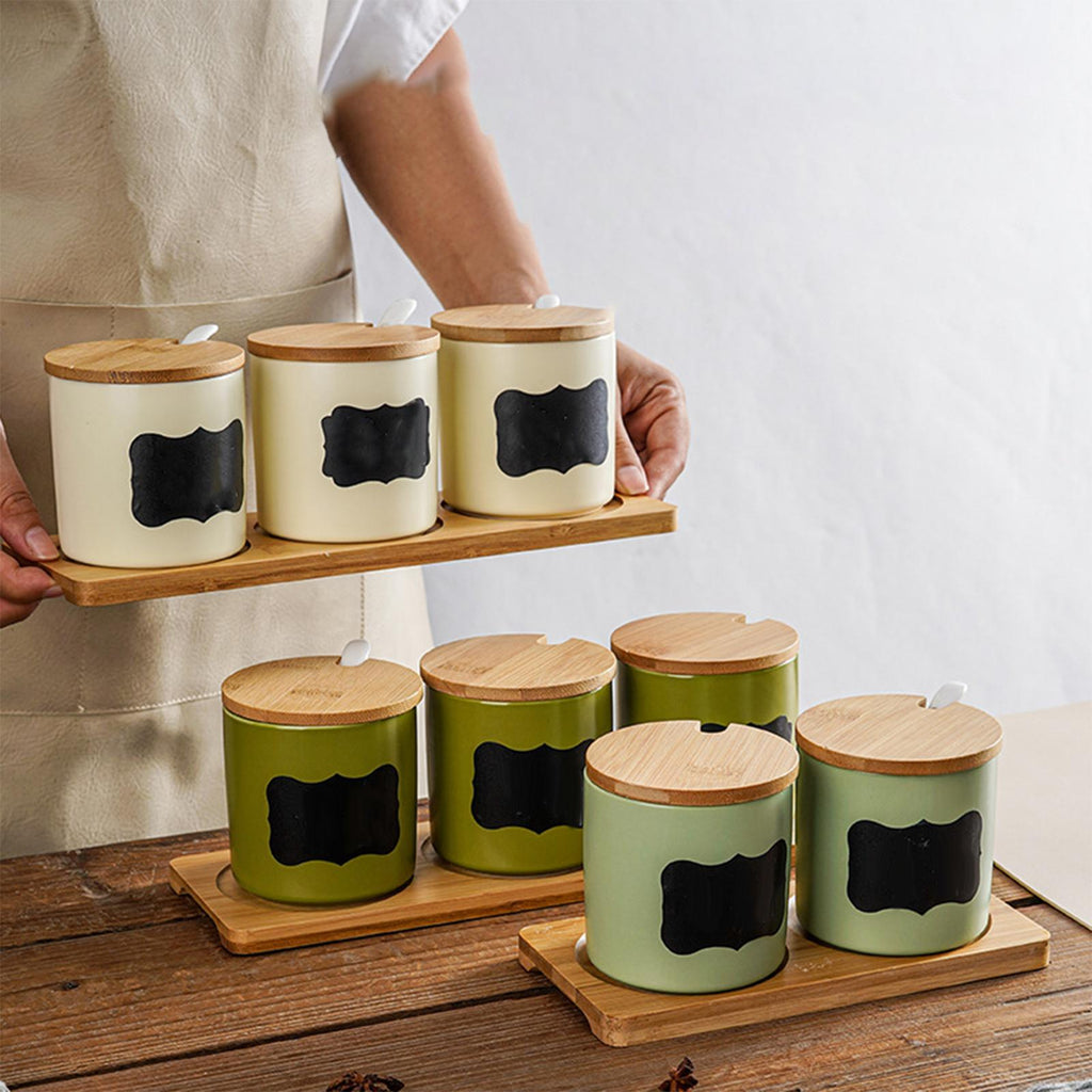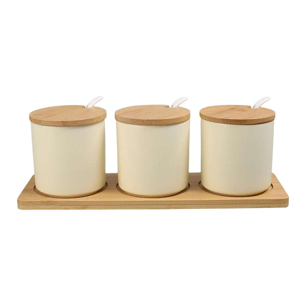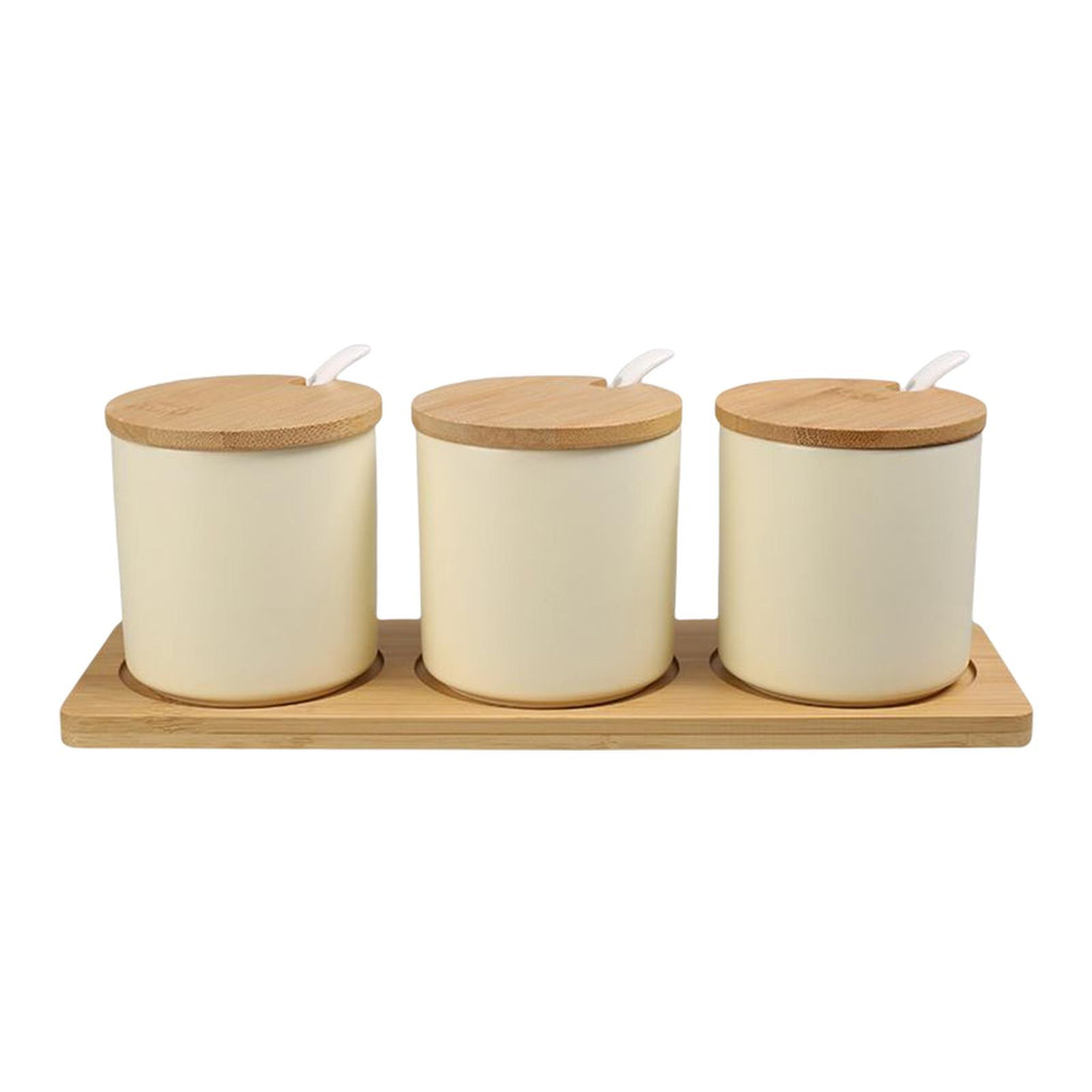Packaging Details: condiment canisters pots include 3 ceramic jars, spoons and lids, a tray and some blank stickers