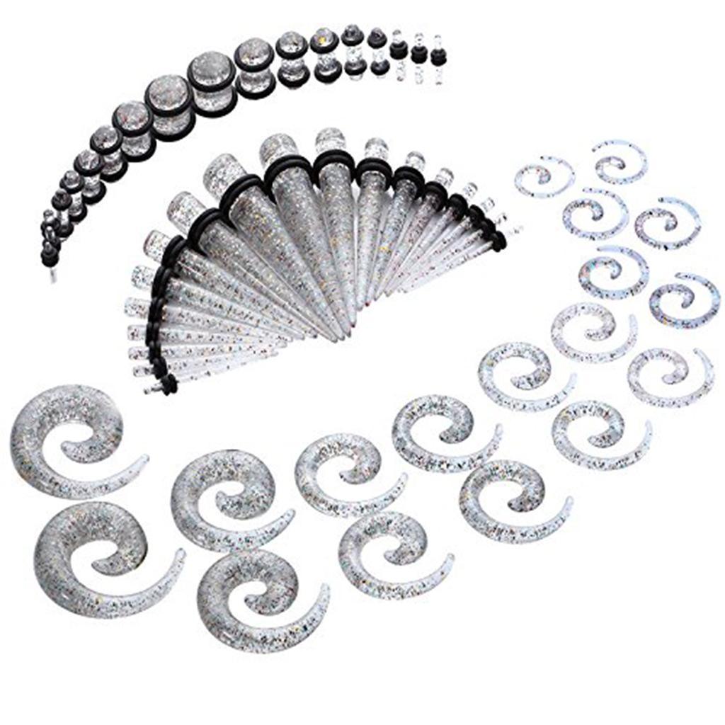 Total of 54 Pieces: 18 Pieces Spiral Ear Tapers 14G-00G, 18 Pieces Straight Ear Tapers 14G-00G, 18 Pieces Double O-Ring Ear Plugs 14G-00G