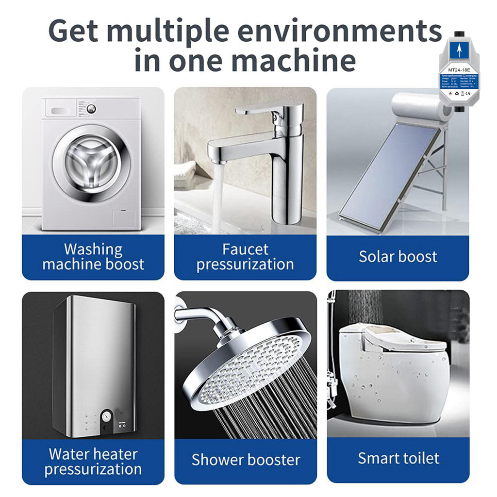 Water Pressure Booster Pump: DC 24V water boosting pump, low voltage start, the Max flow is 25L/min, the max head is 15m.