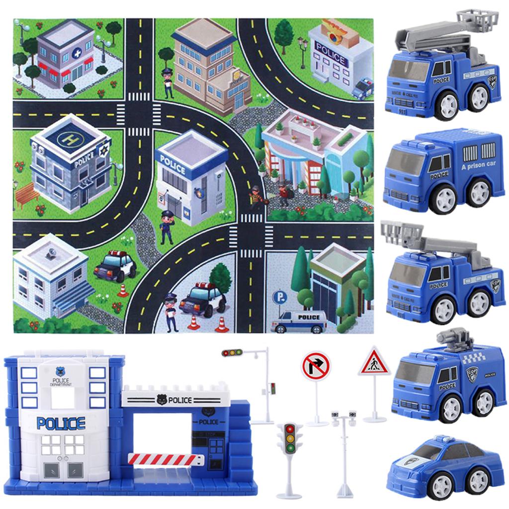 Our Toy Car Sets with Giant City Playing Mat includes a 31.5" x 27.5" carpet playmat and cars, road sign, building etc.