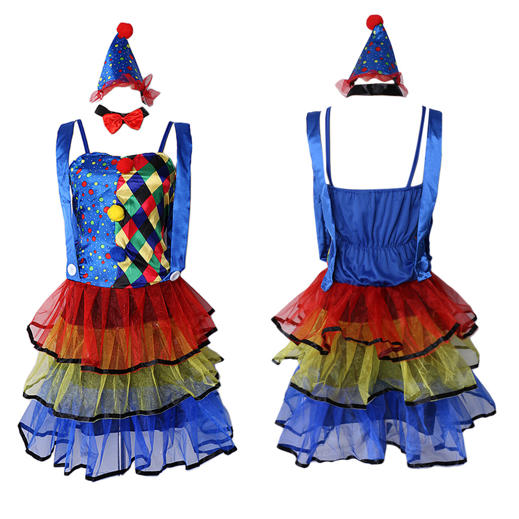 This funny comedy ladies clown costume comes with a dress, a hat and a neck tie.