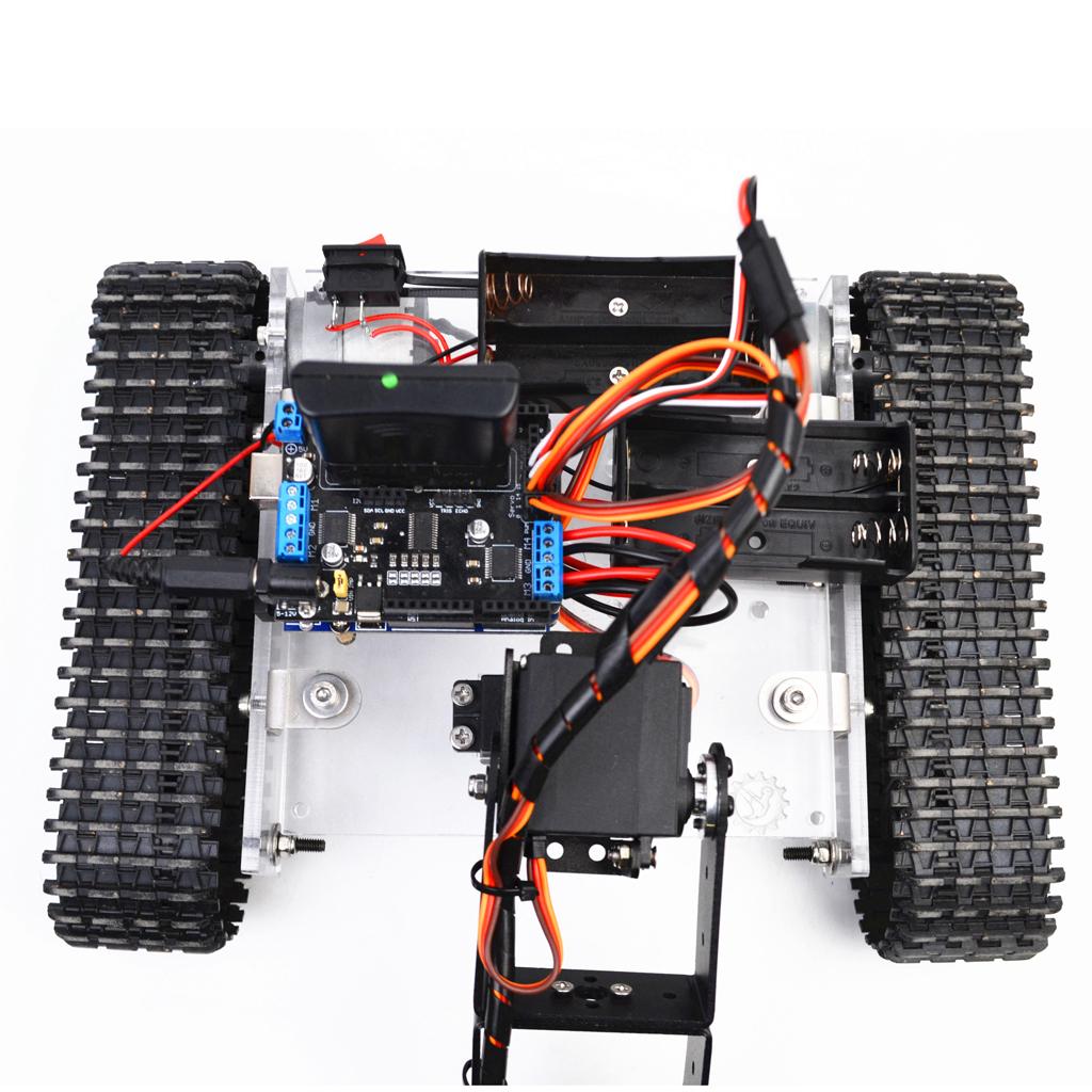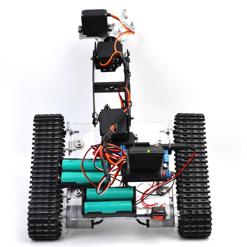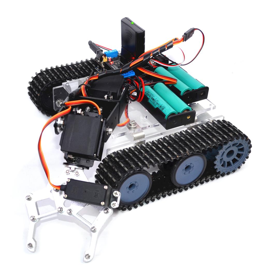 2pcs AAA batteries are needed for remote controller, 2pcs 18650 batteries are needed for tank, and 2pcs 18650 batteries are needed for robot arm, but not included