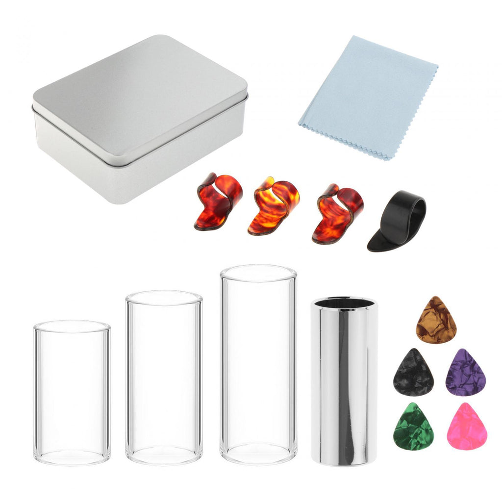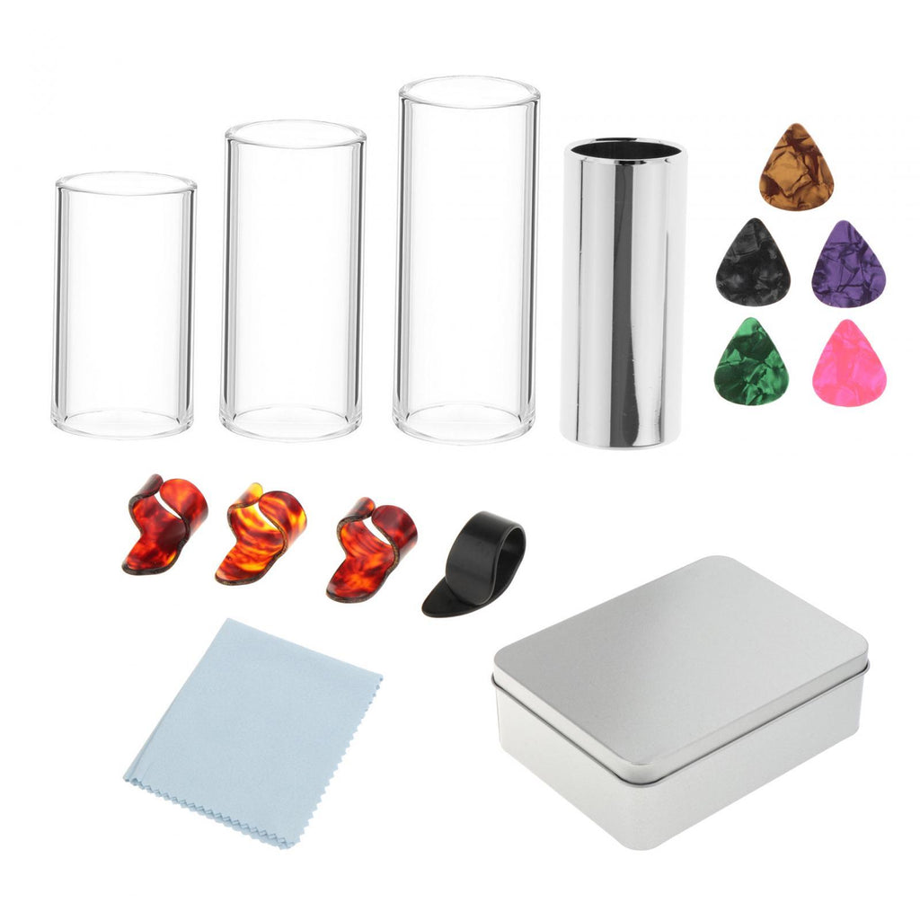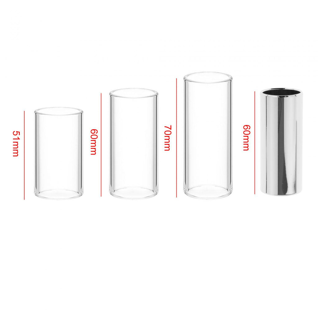1 Piece Glass 51mm Slide Tube 1 Piece 60mm Slide Pipe 1 Piece 70mm Slide Tube 1 Piece 60mm Slide Tube 4 Pieces Celluloid Finger Cots 5 Pieces PicksNote: