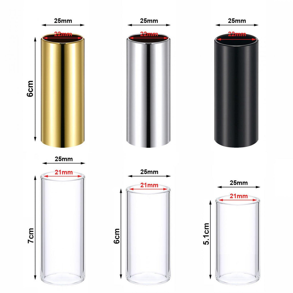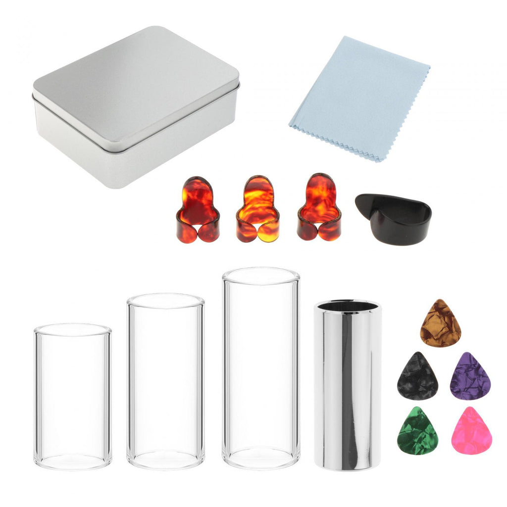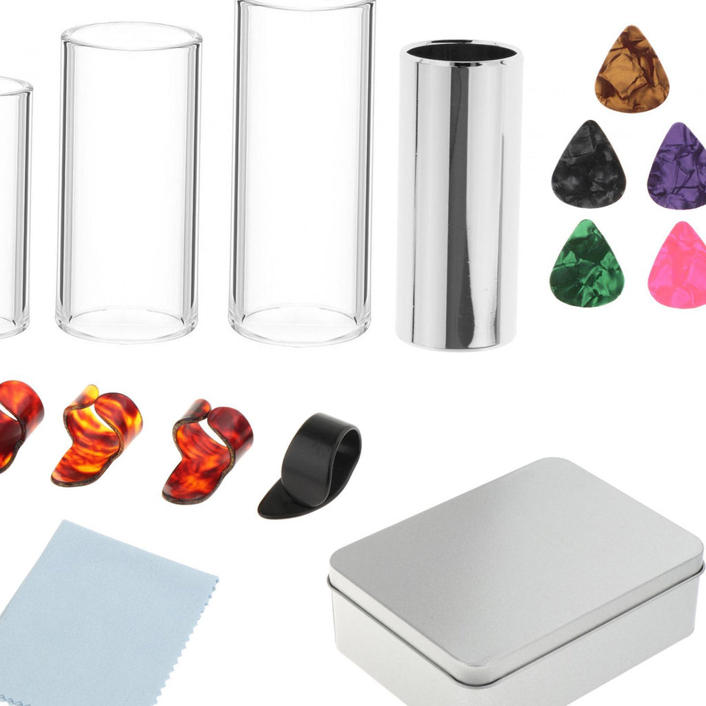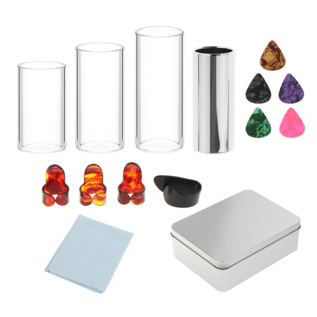 1 Piece Glass 51mm Slide Tube 1 Piece 60mm Slide Pipe 1 Piece 70mm Slide Tube 1 Piece 60mm Slide Tube 4 Pieces Celluloid Finger Cots 5 Pieces PicksNote: