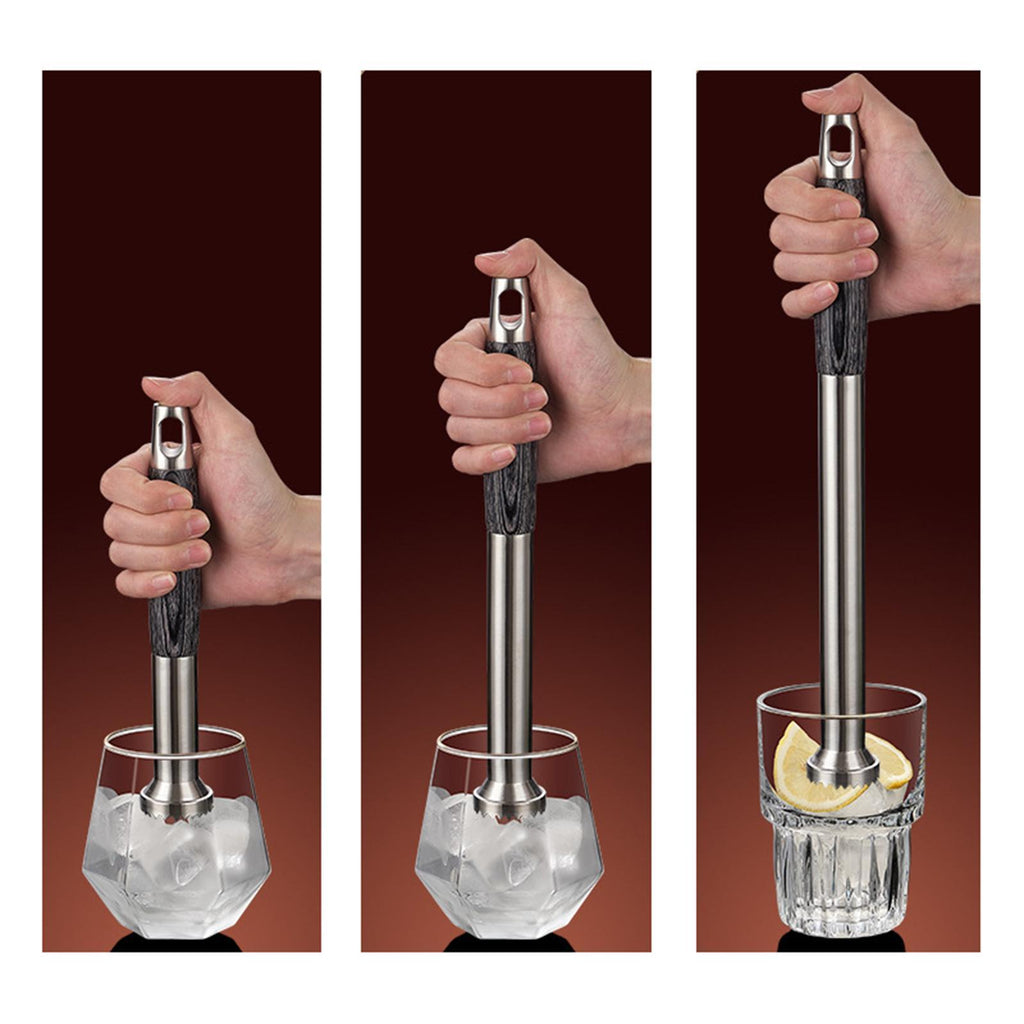【Design】: Our stainless steel ice crusher with wood handle is a necessary bar accessory designed to extract maximum flavor from your favorite cocktails