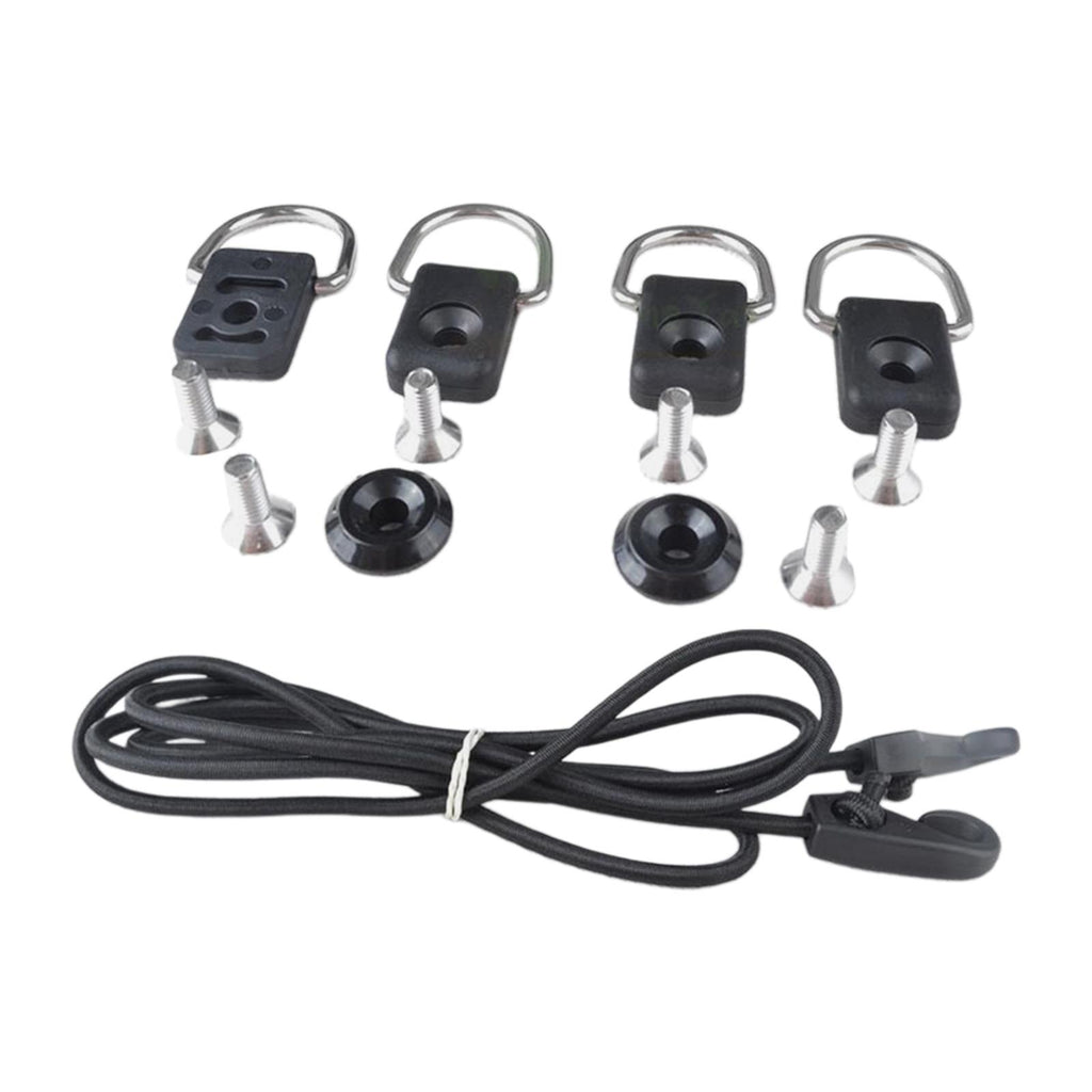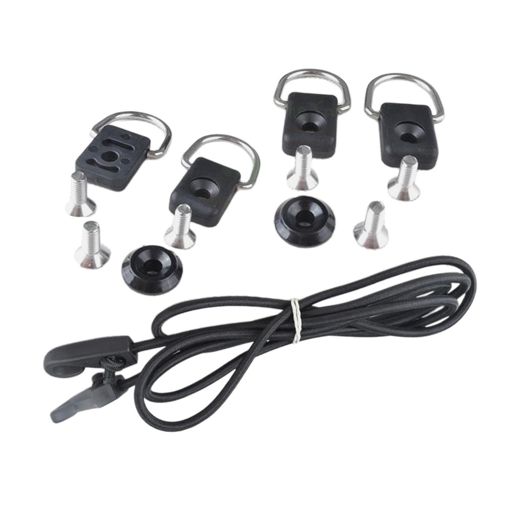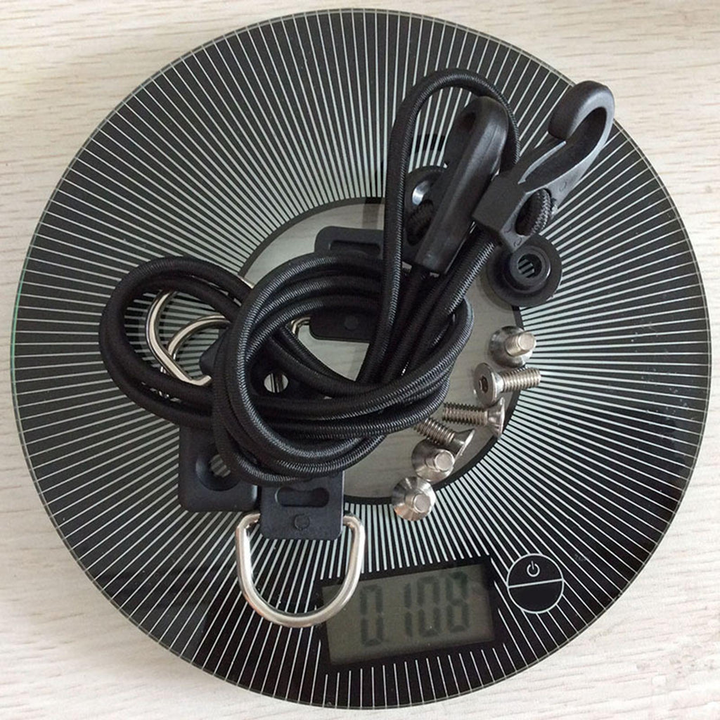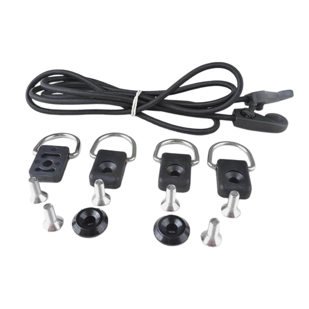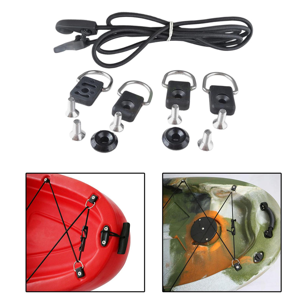 Package Included: Kayak deck rigging Kit Included A 1.5m/59.06inch Length Elastic Bungee Cord (with Cord Hook), 4 Kayak D Rings, 2 Kayak Pad Eye and 6 Screws.