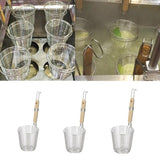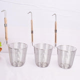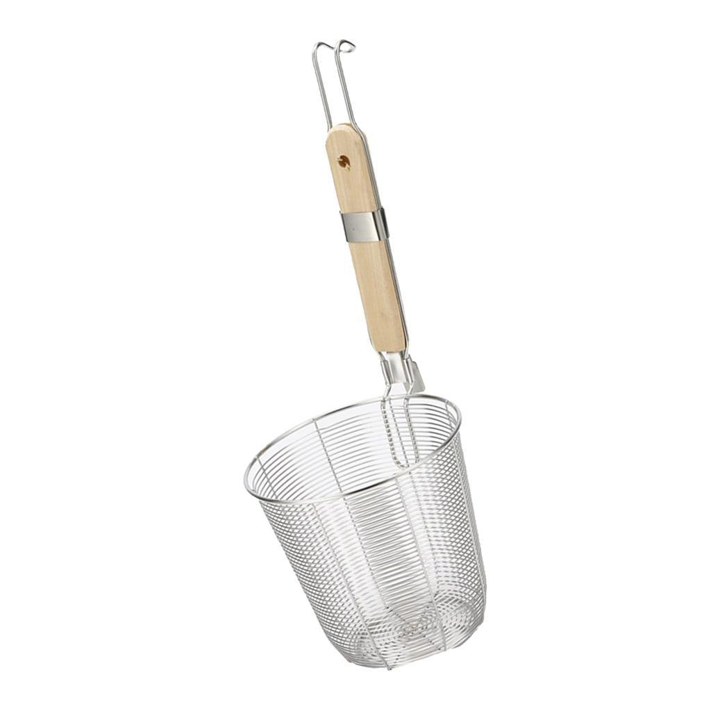 Made from stainless steel mesh with sturdy wire frame; wooden handle with hook conveniently hangs on the pot while in use and stores away easily