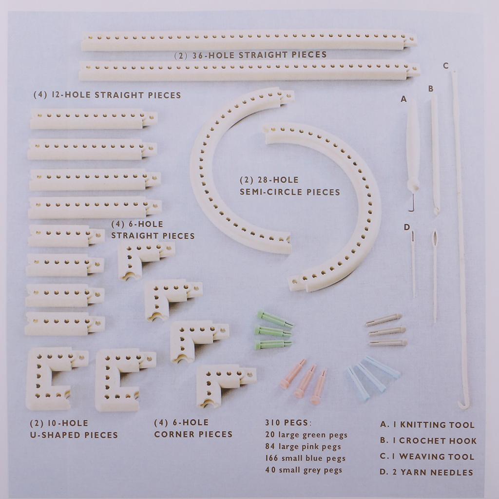 Also has 206 small gauge pegs, 104 large-gauge pegs, Knitting Tool, weaving tool, crochet hook, yarn needles and instruction booklet