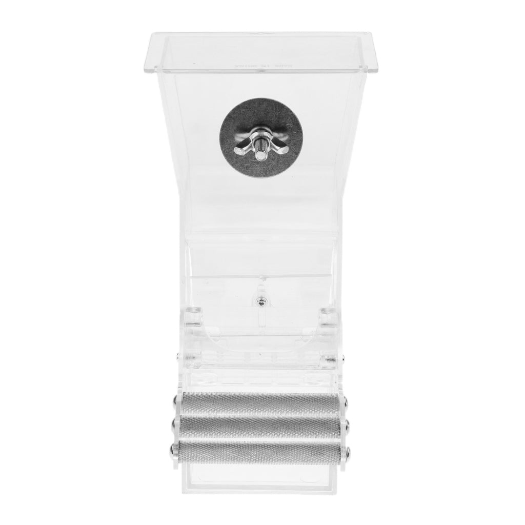 Your bird enters and eats, leaving hulls and uneaten seed behind in the trough like compartment below!