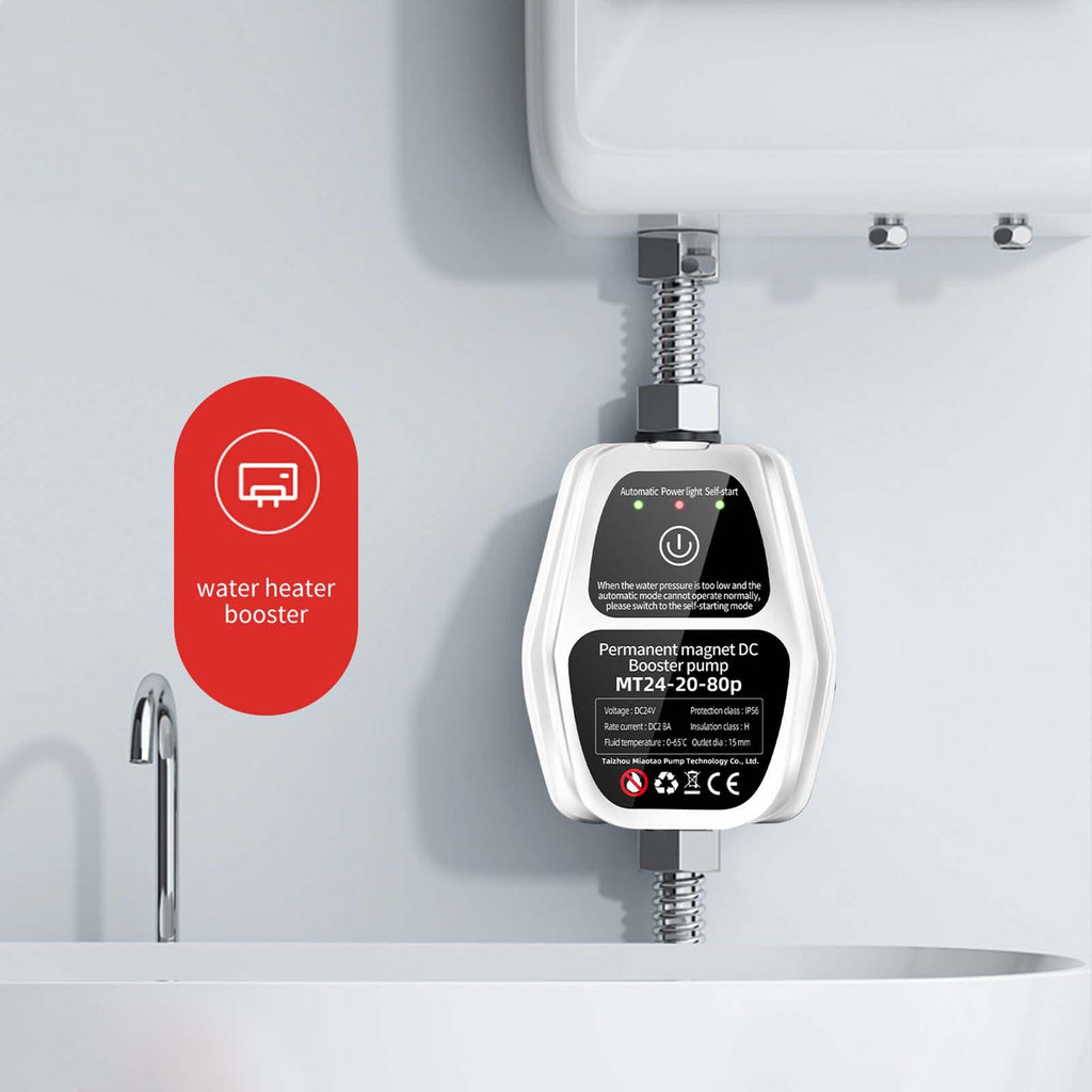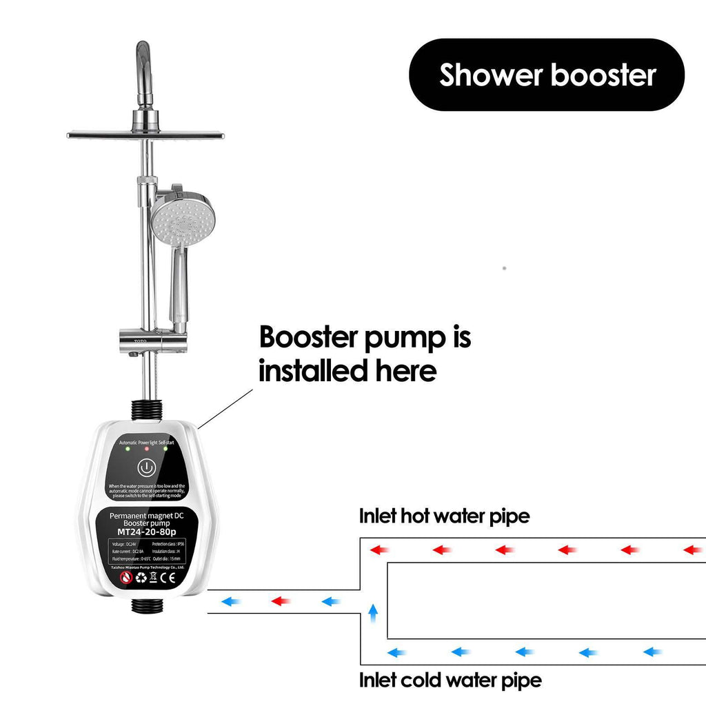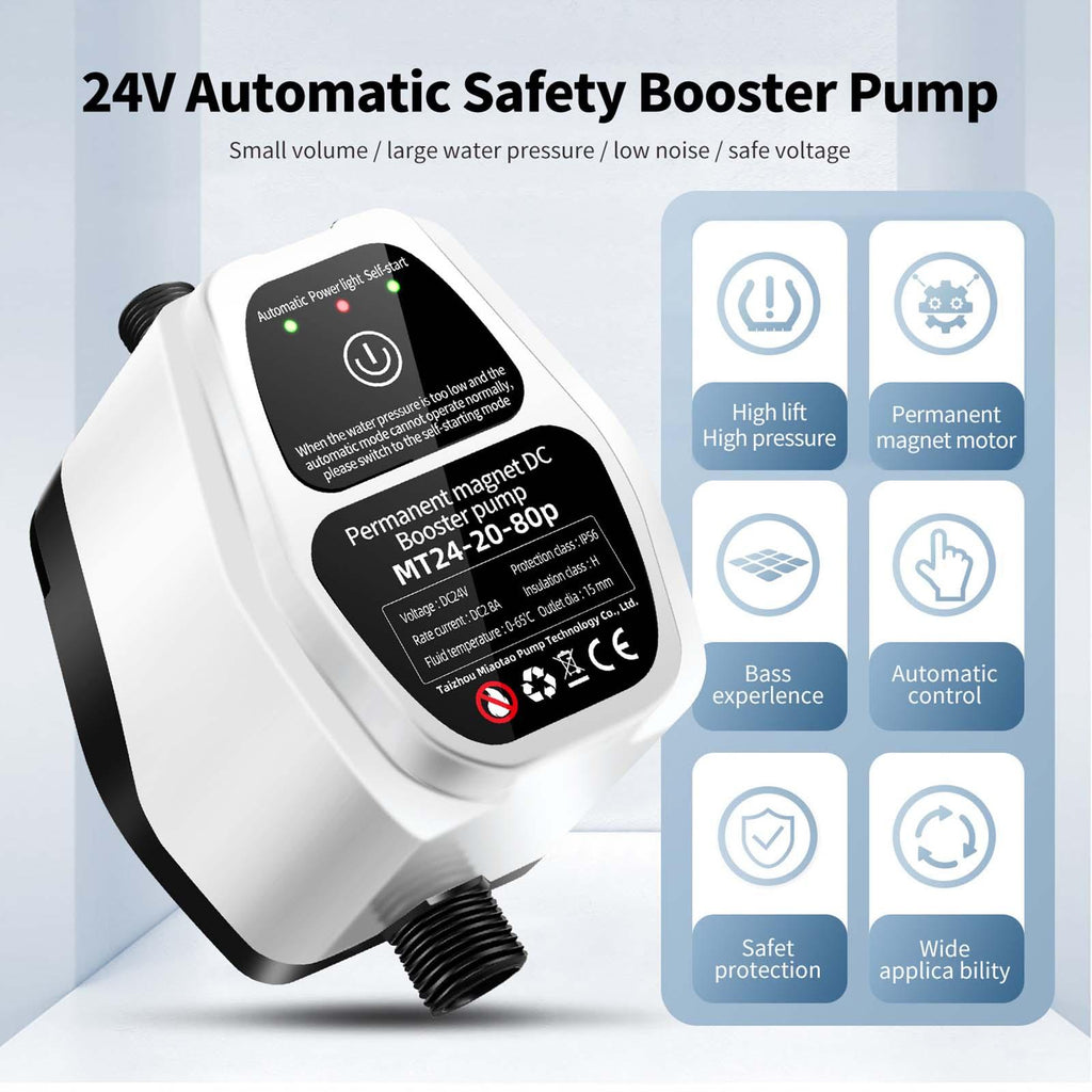 IP56 WATERPROOF: The silent automatic boost pump 24V DC voltage is to operate and will not cause harm to the human body. waterproof material, built in all copper motor , high efficiency and low noise.