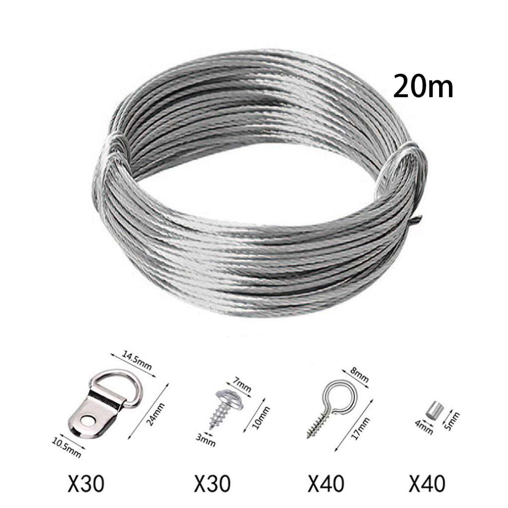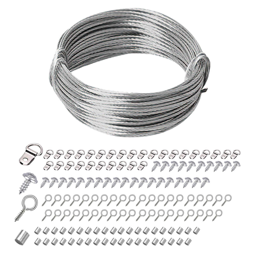 141PCS Includes: 1 roll 20m picture hanging wire, 30pcs picture hangers, 30pcs screws, 40pcs screw eye pins, and 40pcs crimping sleeves;Note: