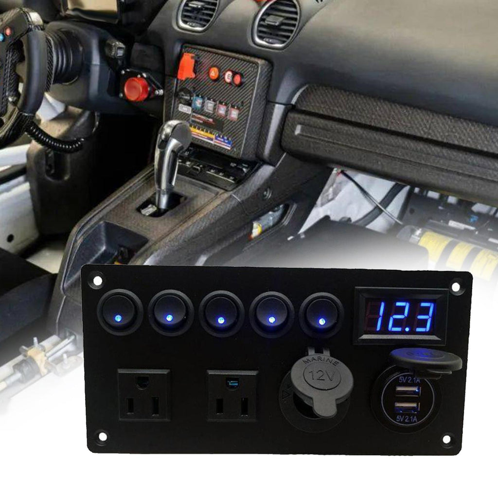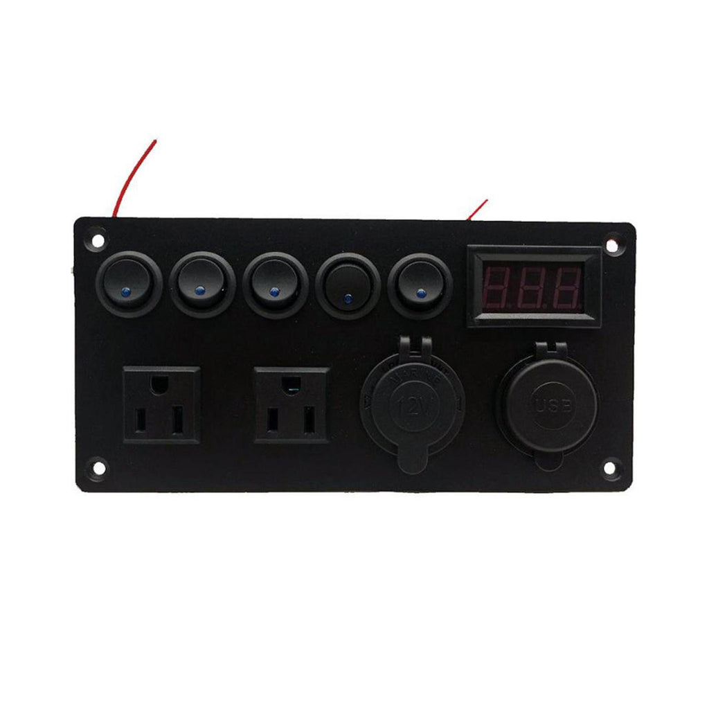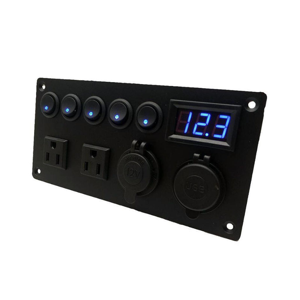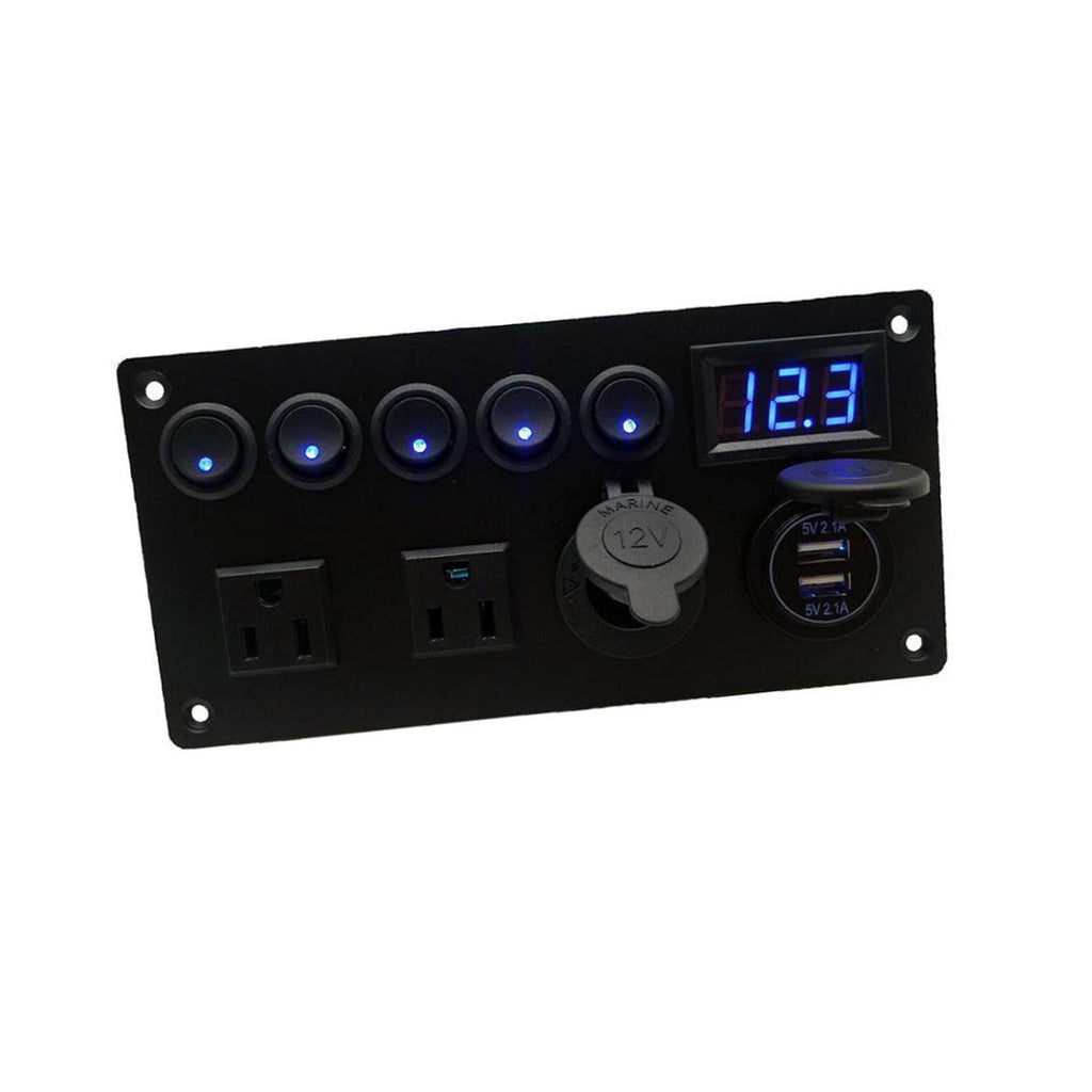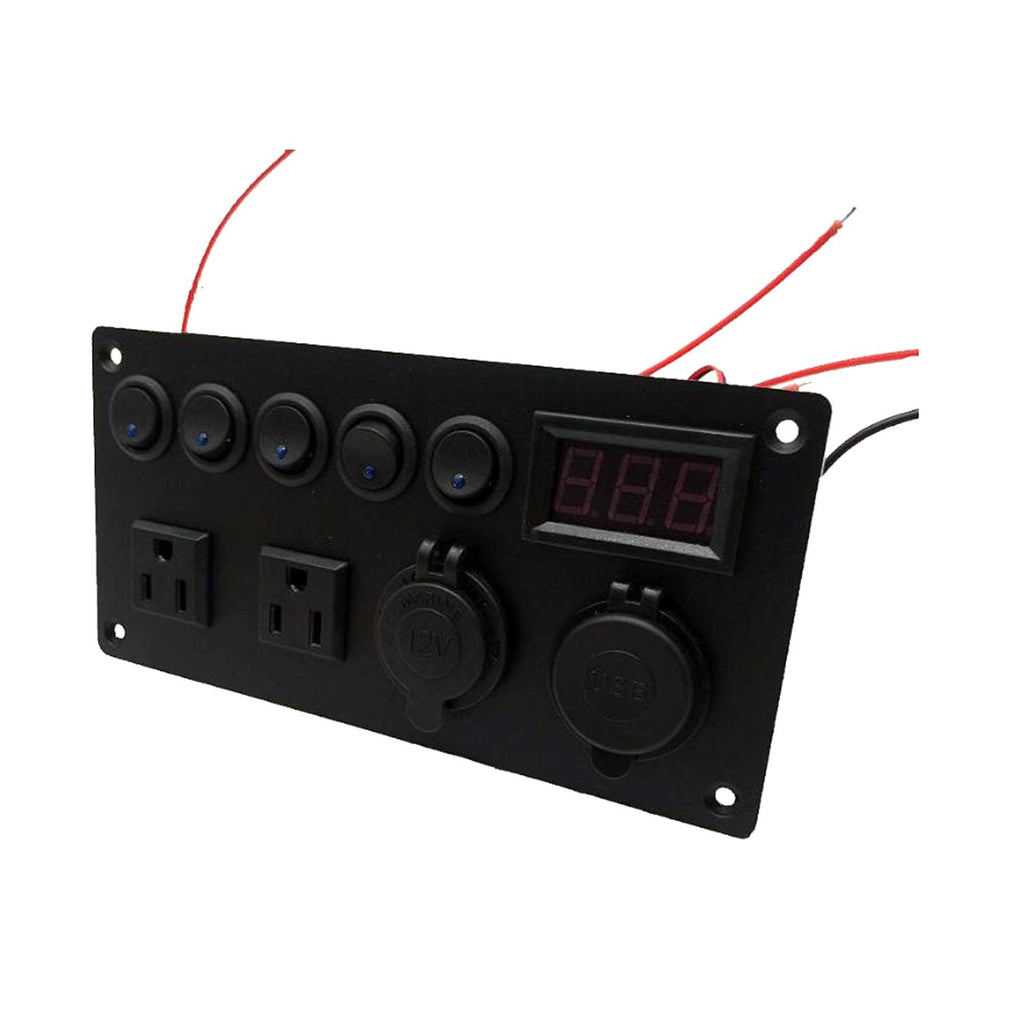 【MULTIFUNCTIONS PANEL KIT】 Dual USB charger: DC 5V/2.1A & 2.1A; Voltmeter display range: 0 - 24V; Dual Outlets: AC125V 15A; 5 Gang Toggle Switches: DC 12V 20A