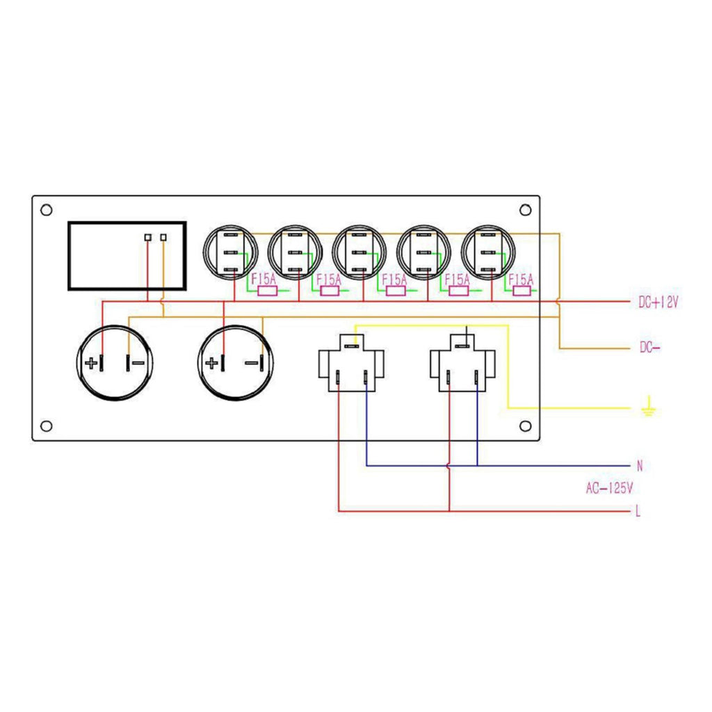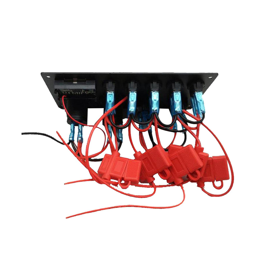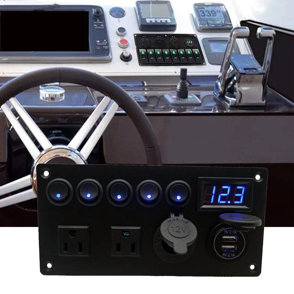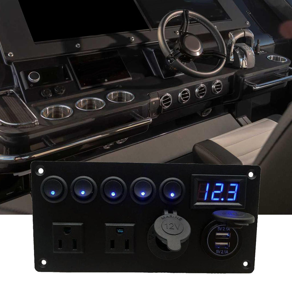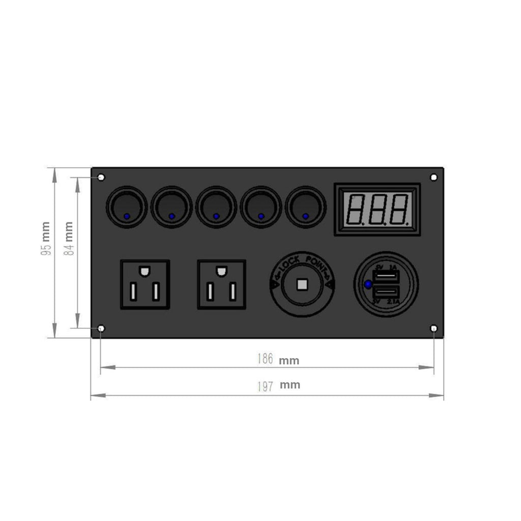 【MULTIFUNCTIONS PANEL KIT】 Dual USB charger: DC 5V/2.1A & 2.1A; Voltmeter display range: 0 - 24V; Dual Outlets: AC125V 15A; 5 Gang Toggle Switches: DC 12V 20A