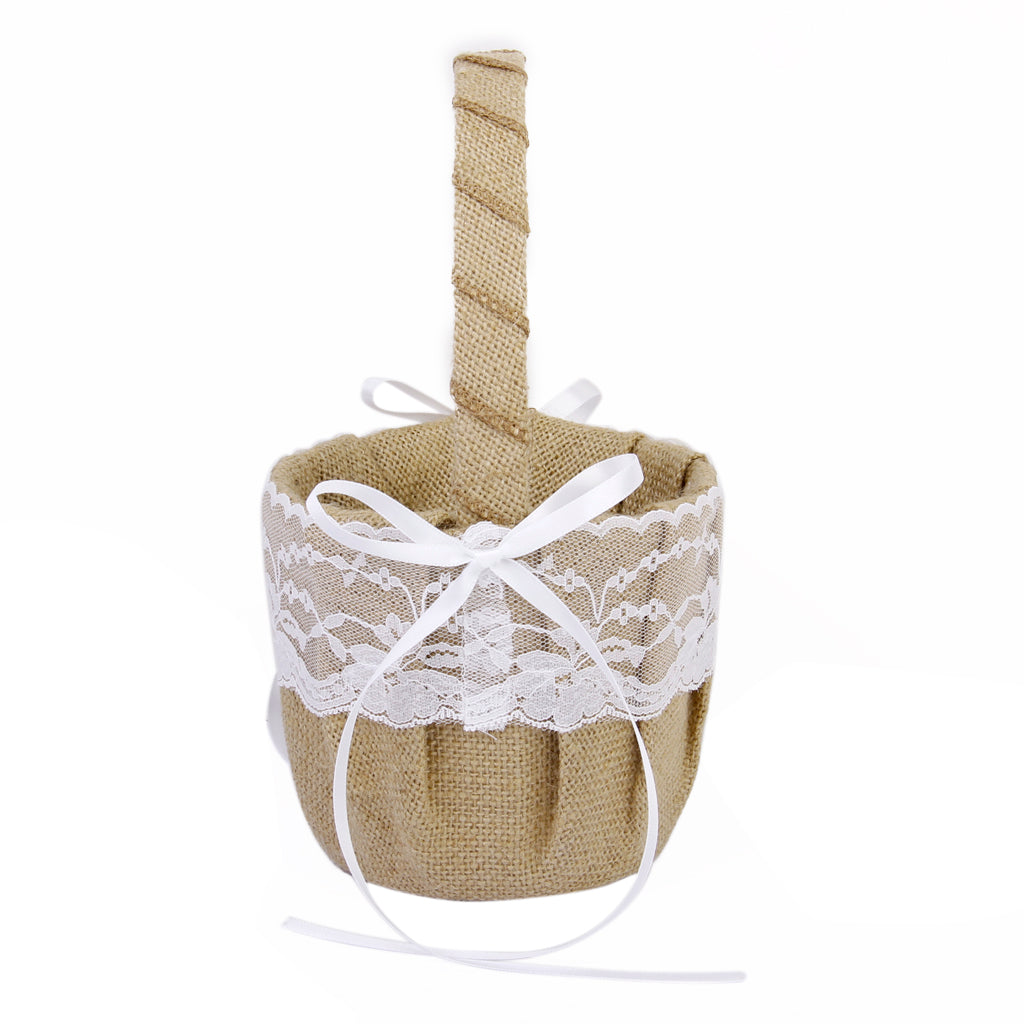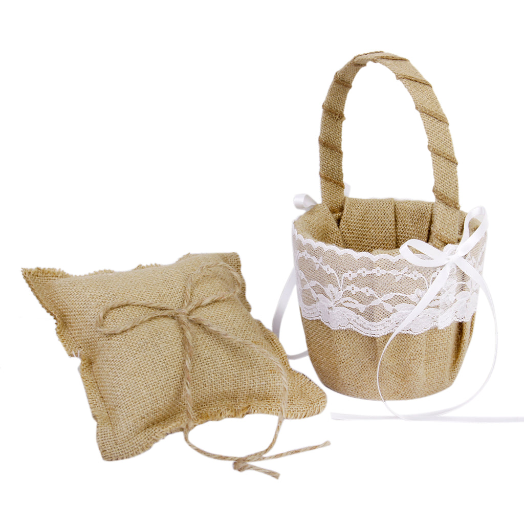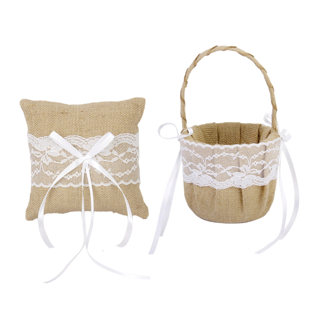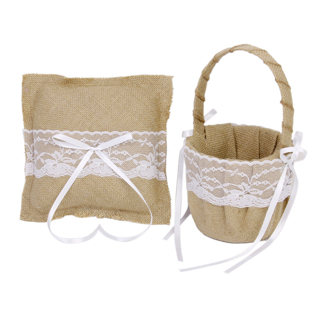 Maxbell Rustic Wedding Ceremony Burlap Lace Flower Basket + Ring Bearer Pillow Decoration