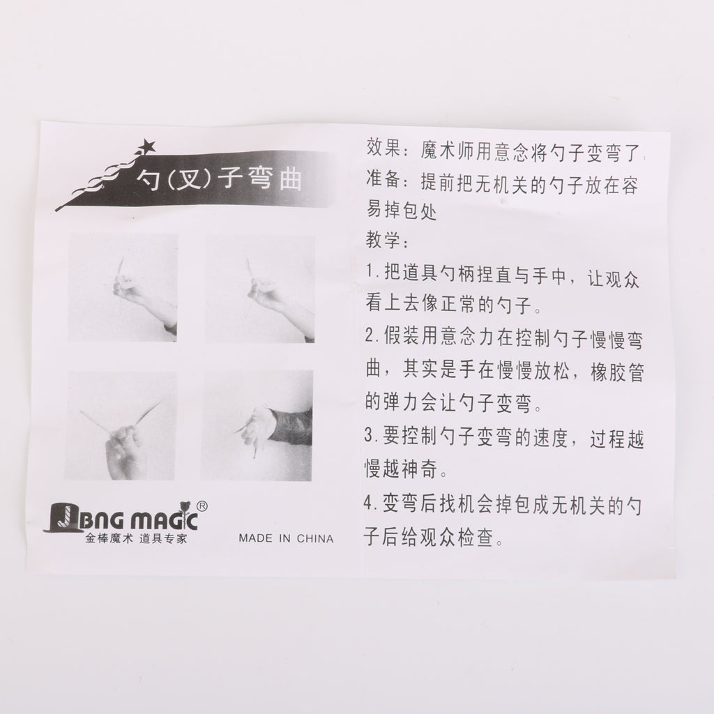 • Picking up a spoon off the table, let the audience check to make sure the spoon is no problem, get the cracked spoon in your hand and then concentrate slowly rubbing spoon, and told the audience after the friction will produce heat, this time the spoon really bending. After that you can change to the bend spoon without rubber, and ask audience to check again, it’s really shock
