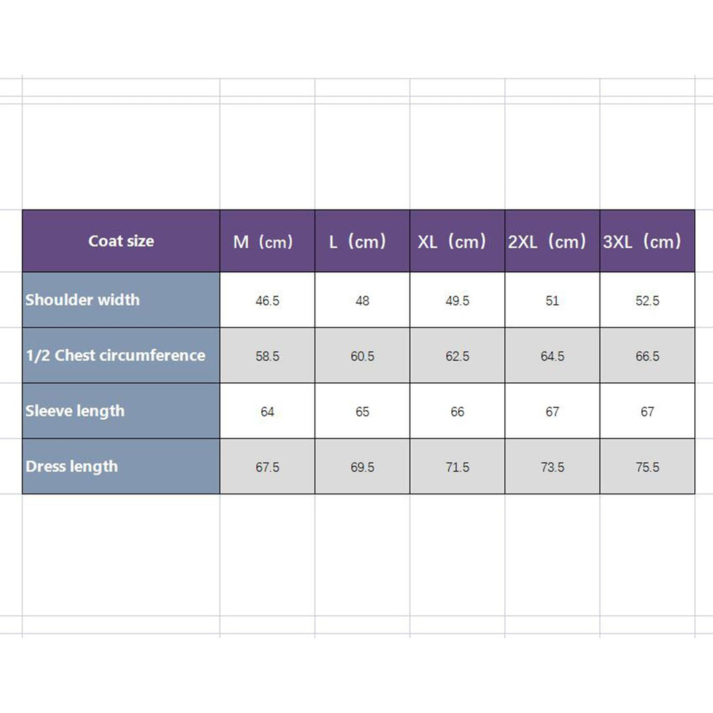 3XL: Shoulder width: 52.5cm/20.67inch, 1/2 Chest circumference: 66.5cm/26.18inch, Sleeve length: 67cm/26.38inch, Back Middle Length: 75.5cm/29.72inch
